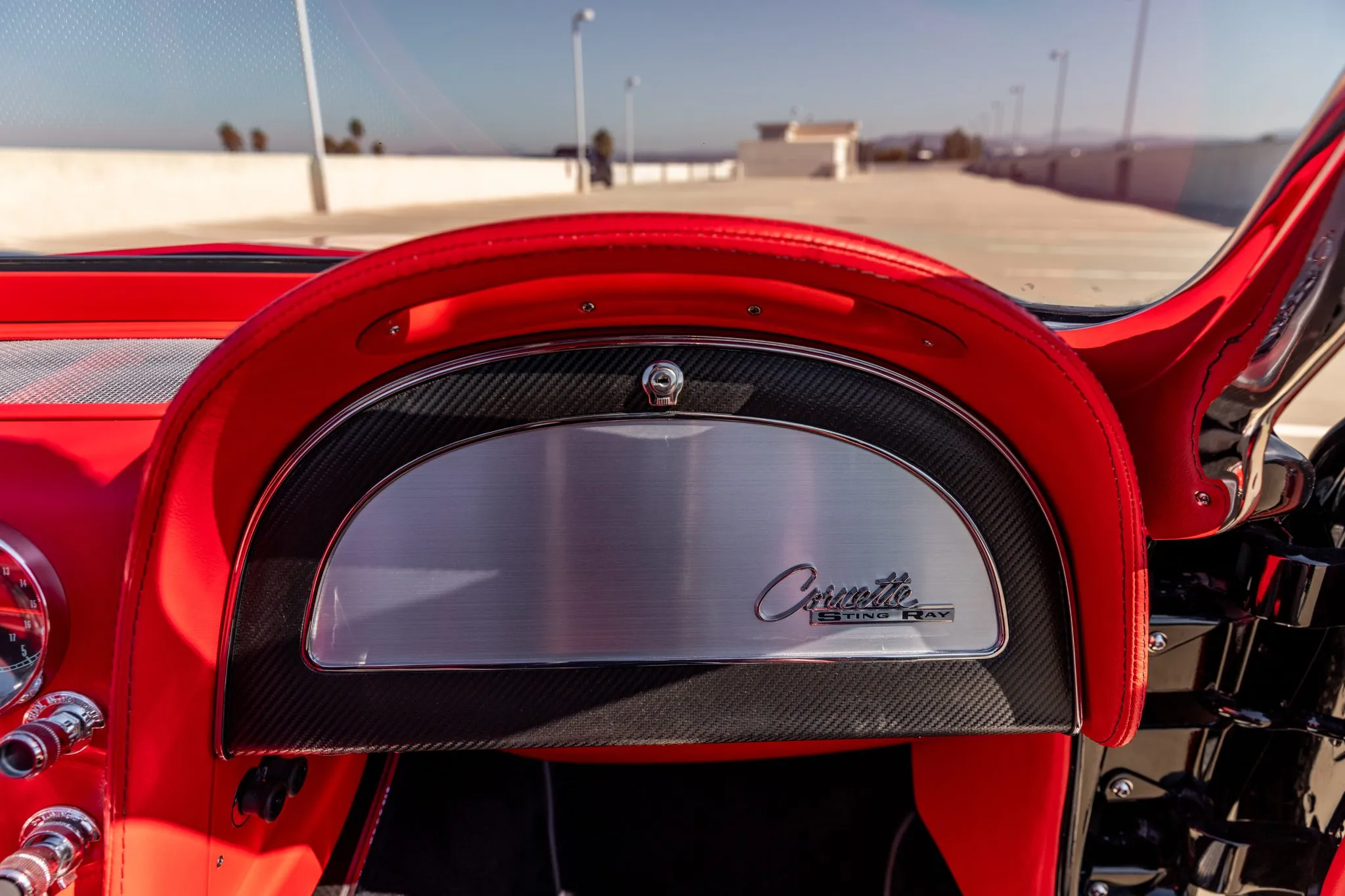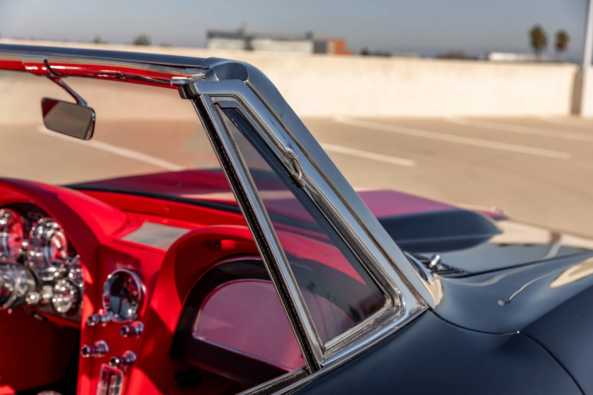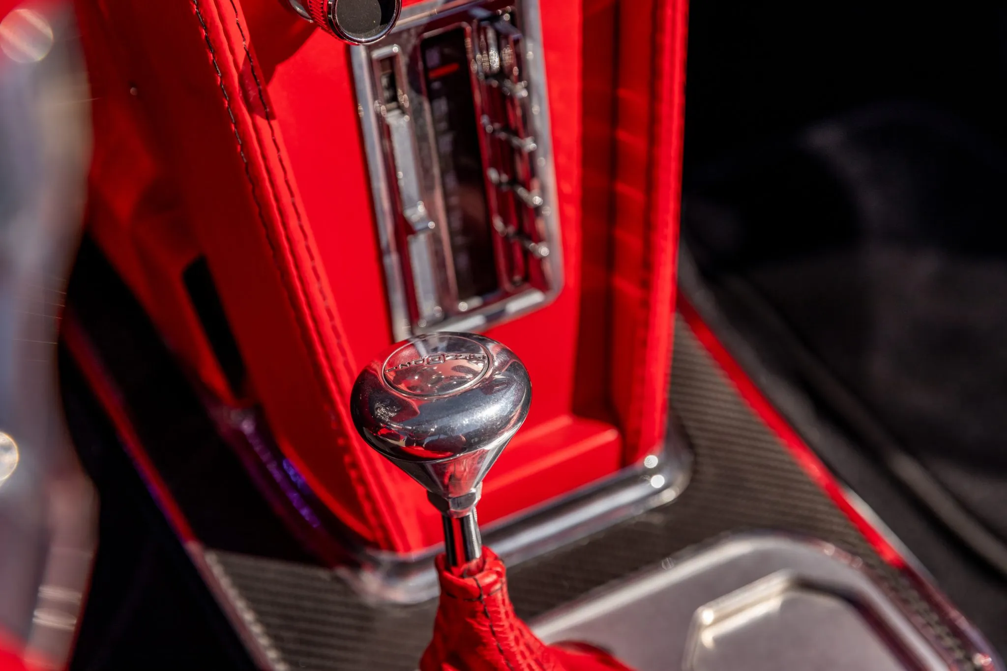 Step inside, and the interior unveils a world of sophistication. Custom-bolstered bucket seats in rich red leather greet occupants, creating a seamless connection with the exterior aesthetic. The colour-matched dashboard, door panels, and shift boot echo the commitment to a cohesive design. While retaining a classic feel with features like a push-button radio and AutoMeter gauges, modern comforts shine through with power windows and a contemporary digital gauge cluster.
