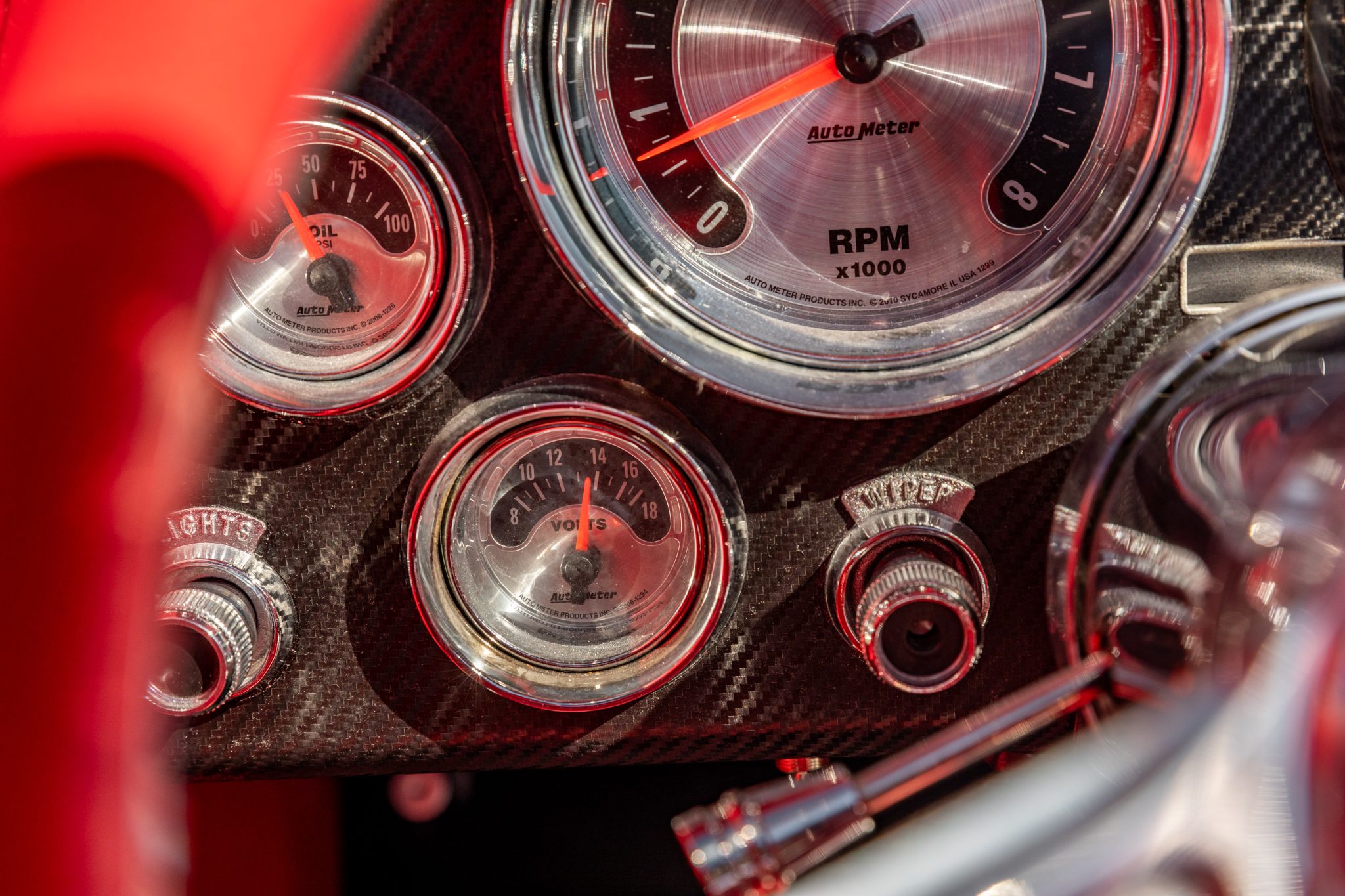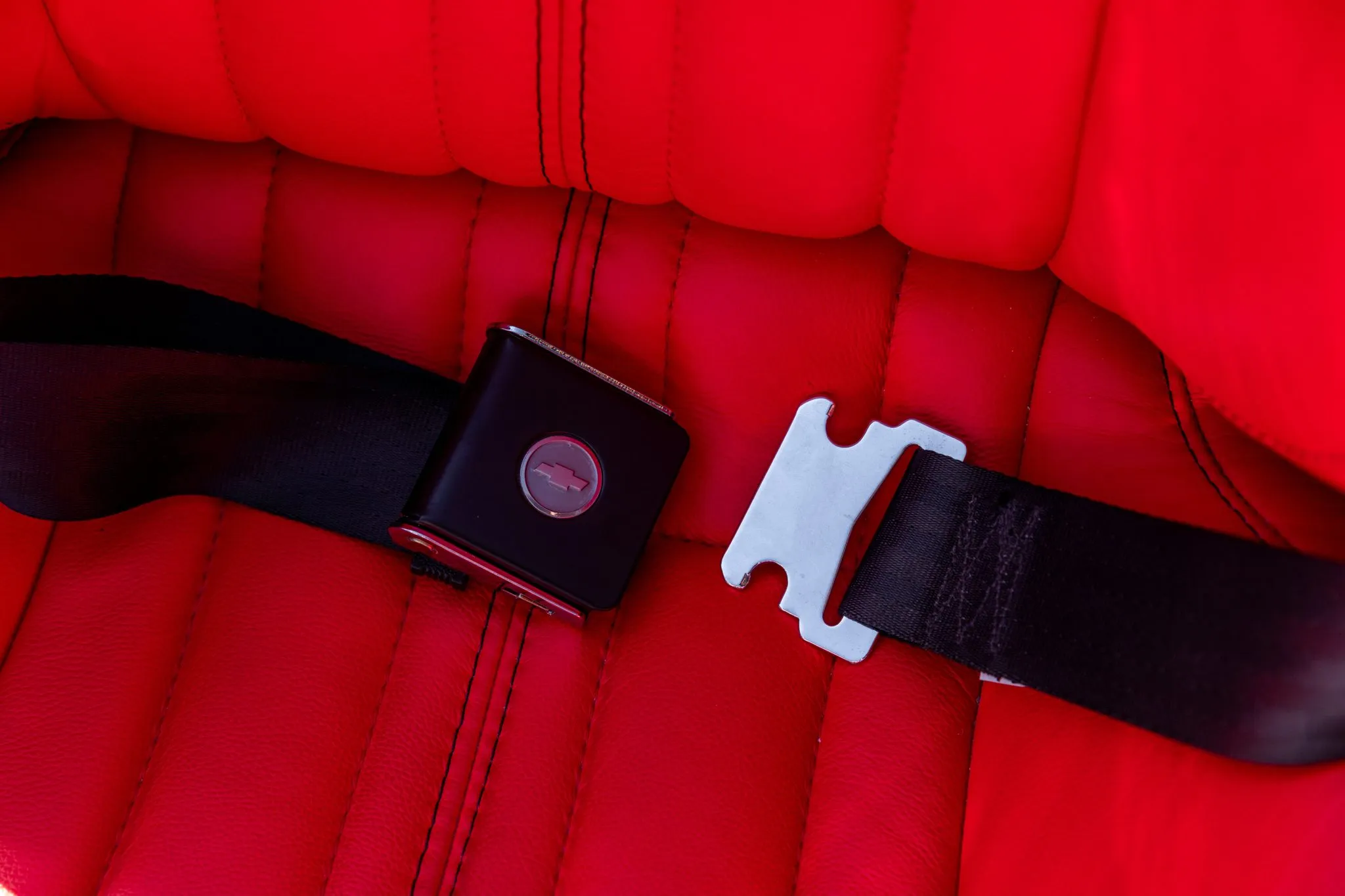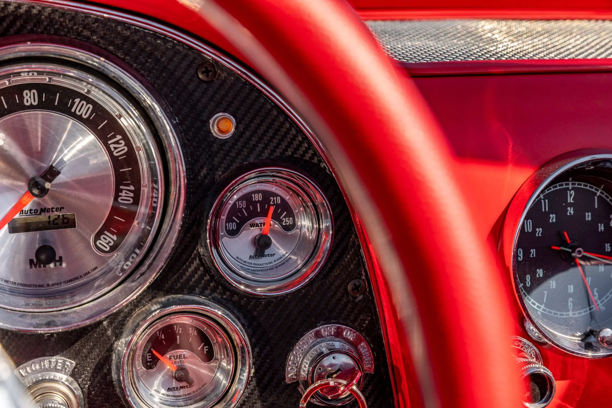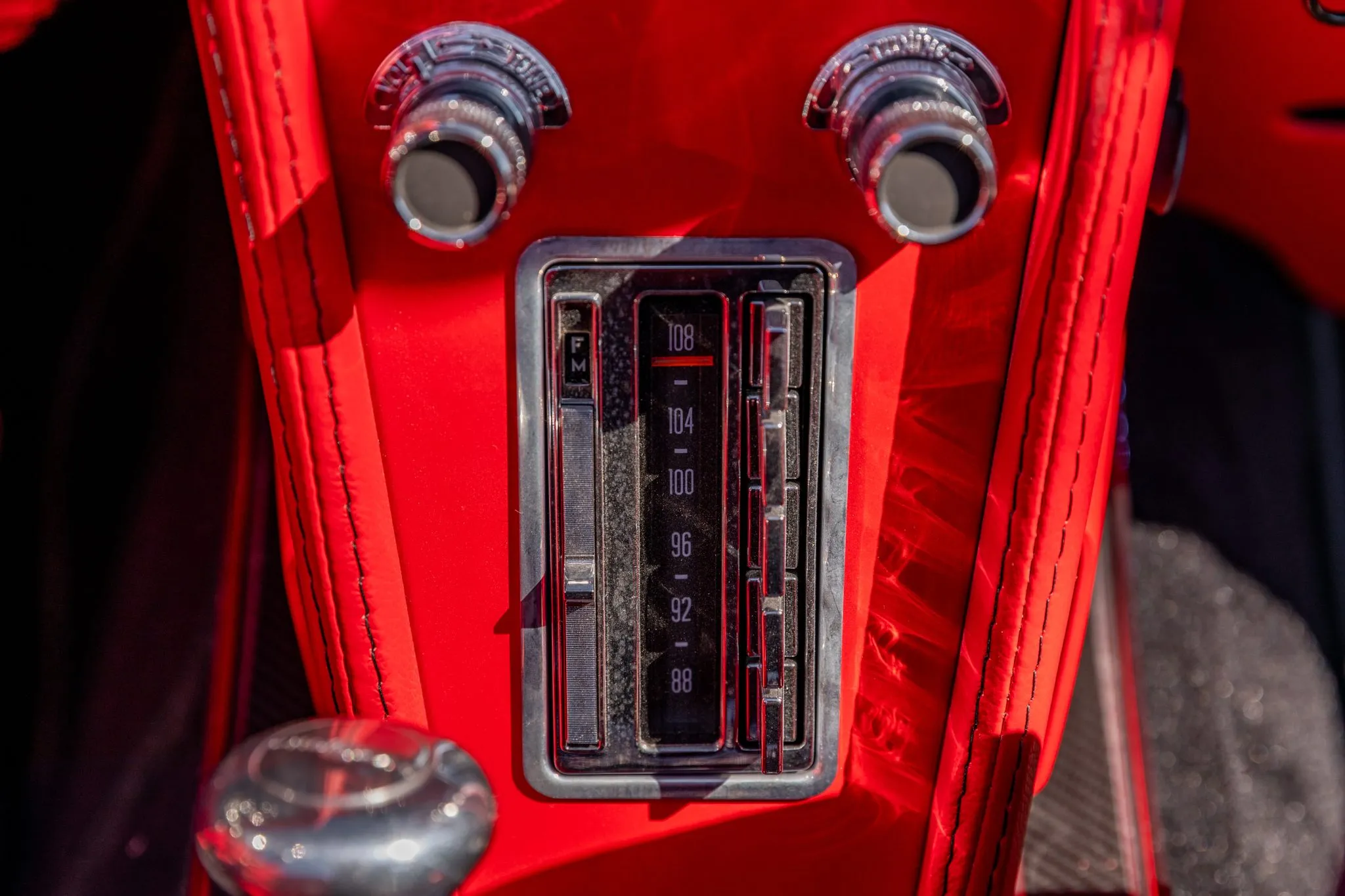 Step inside, and the interior unveils a world of sophistication. Custom-bolstered bucket seats in rich red leather greet occupants, creating a seamless connection with the exterior aesthetic. The colour-matched dashboard, door panels, and shift boot echo the commitment to a cohesive design. While retaining a classic feel with features like a push-button radio and AutoMeter gauges, modern comforts shine through with power windows and a contemporary digital gauge cluster.