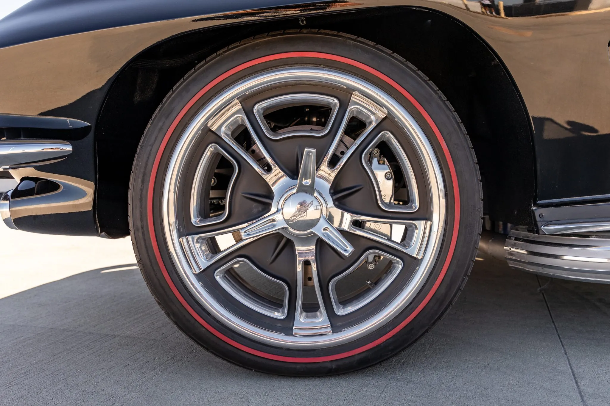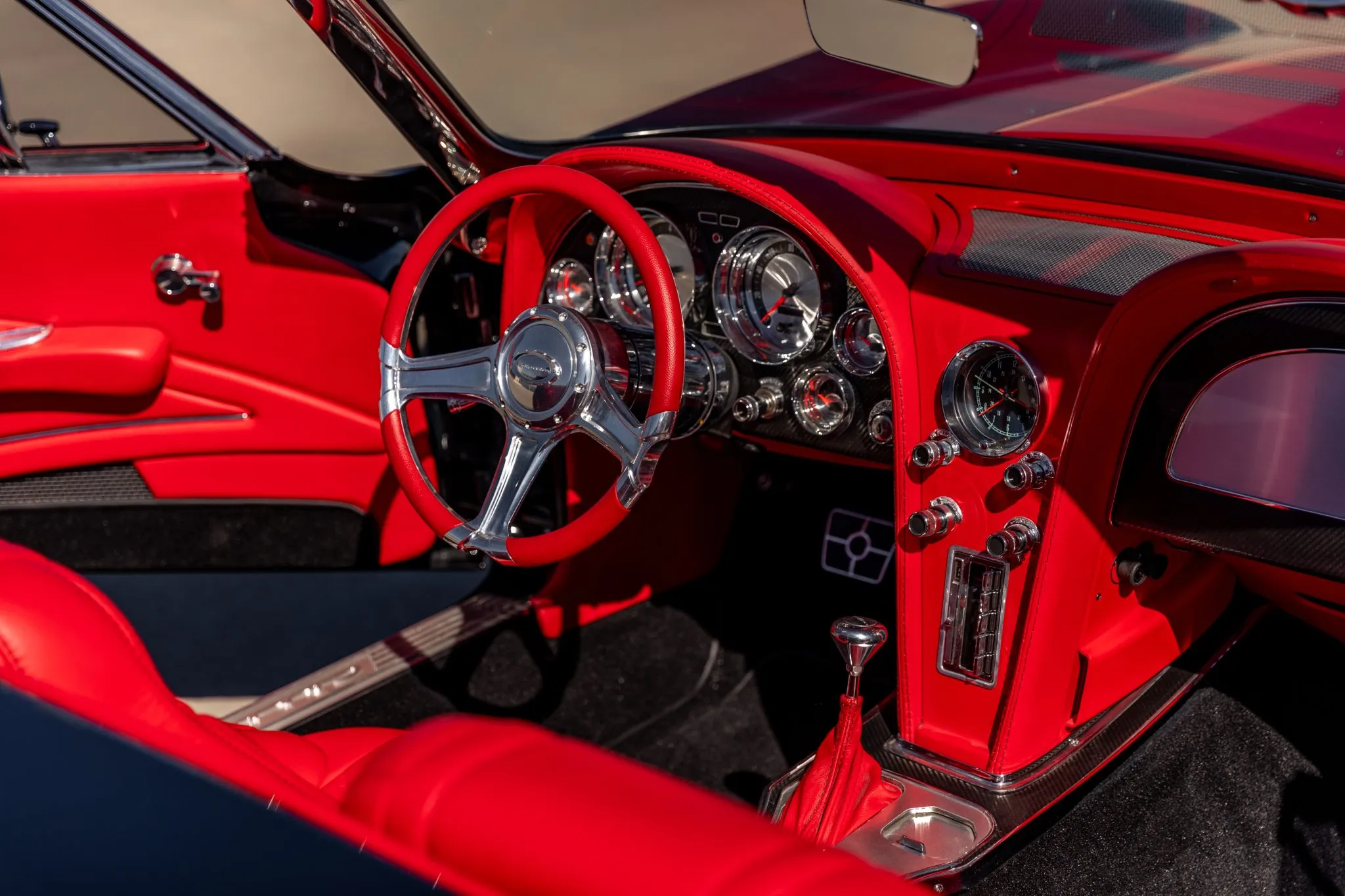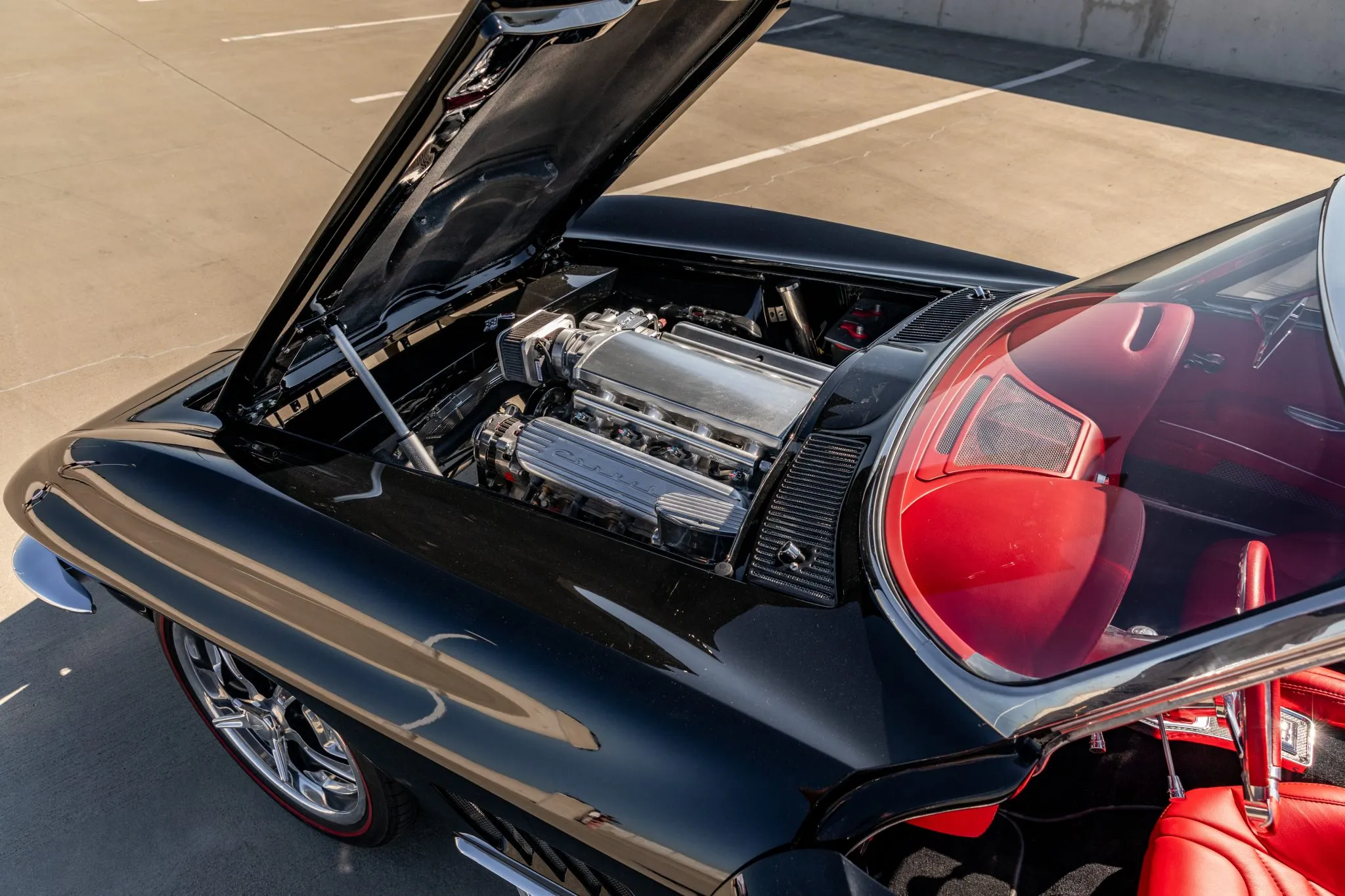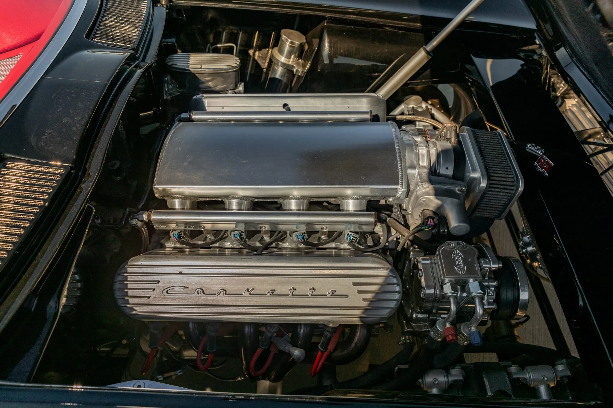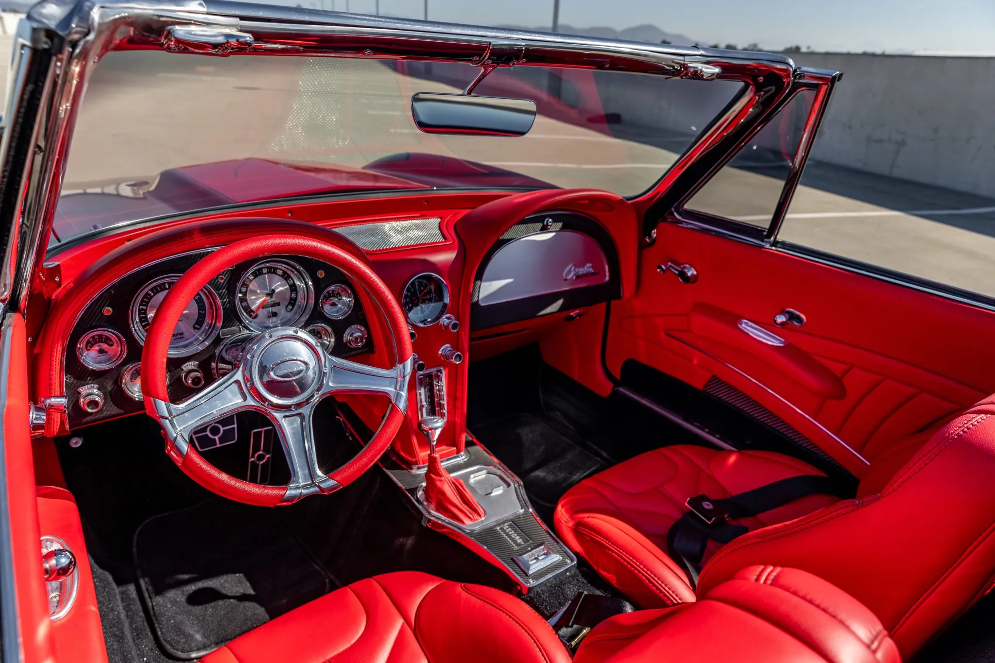 This C2 build doesn’t just stop at aesthetics and power—it’s equipped for an exhilarating driving experience. Strange Engineering coilovers and QA1 springs join forces with front and rear sway bars, ensuring impeccable handling. The power-assisted rack-and-pinion steering ensures precision, while the polished six-piston Wilwood brakes at the front and four-piston rear callipers deliver commanding stopping power over drilled and slotted rotors.