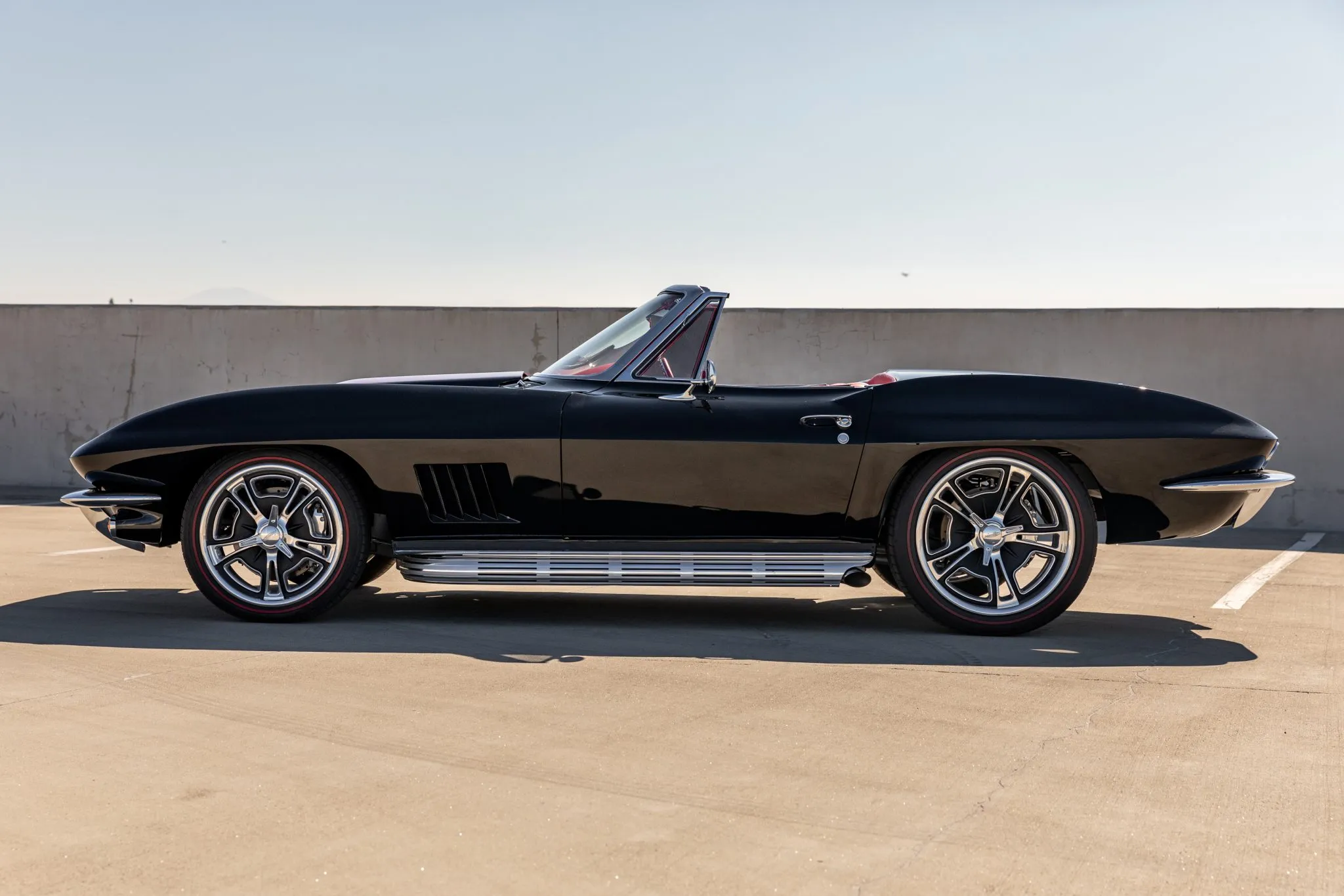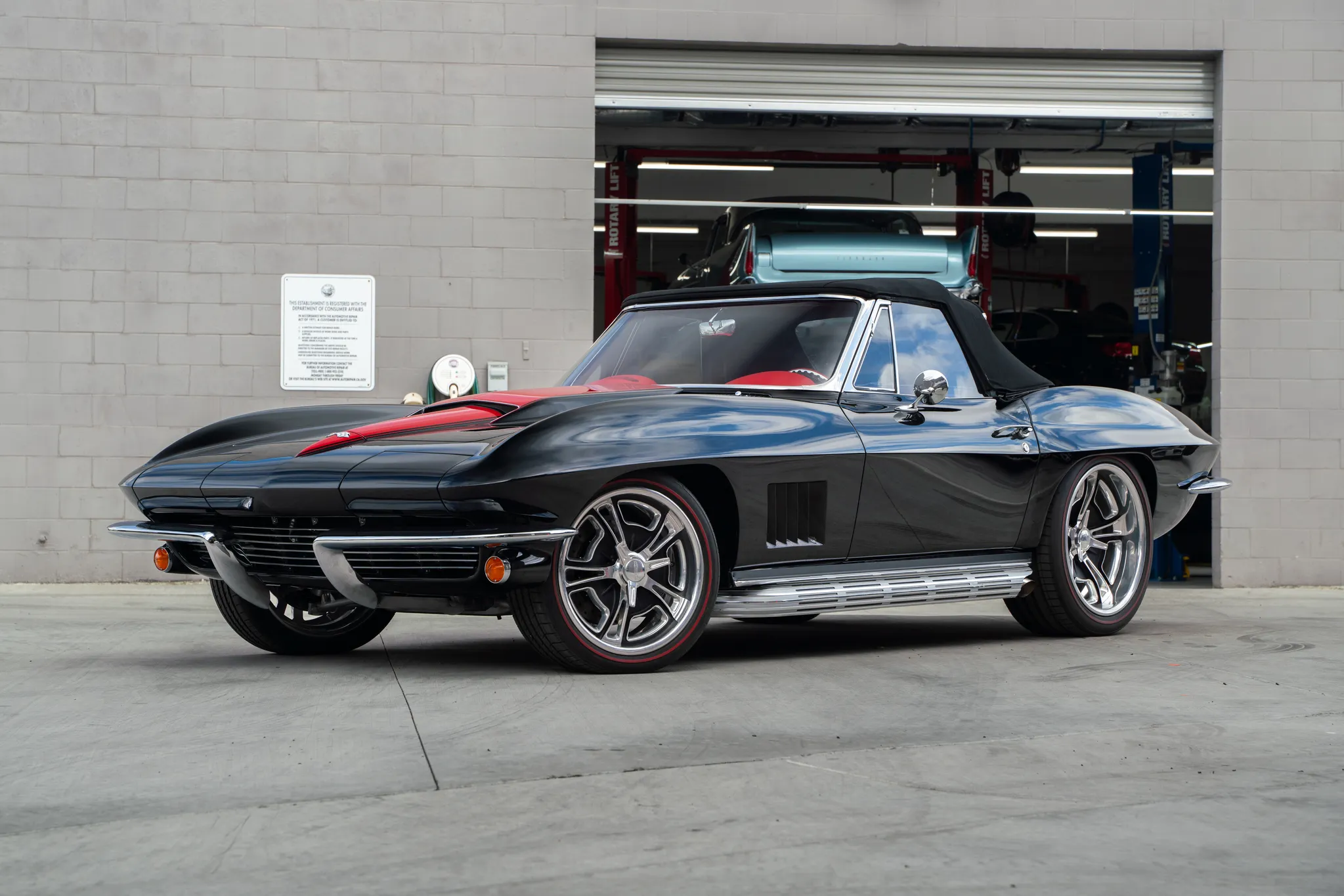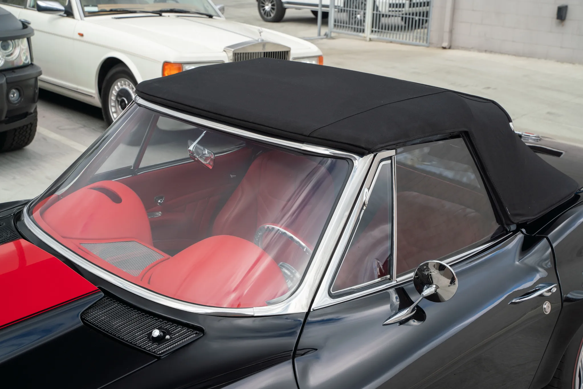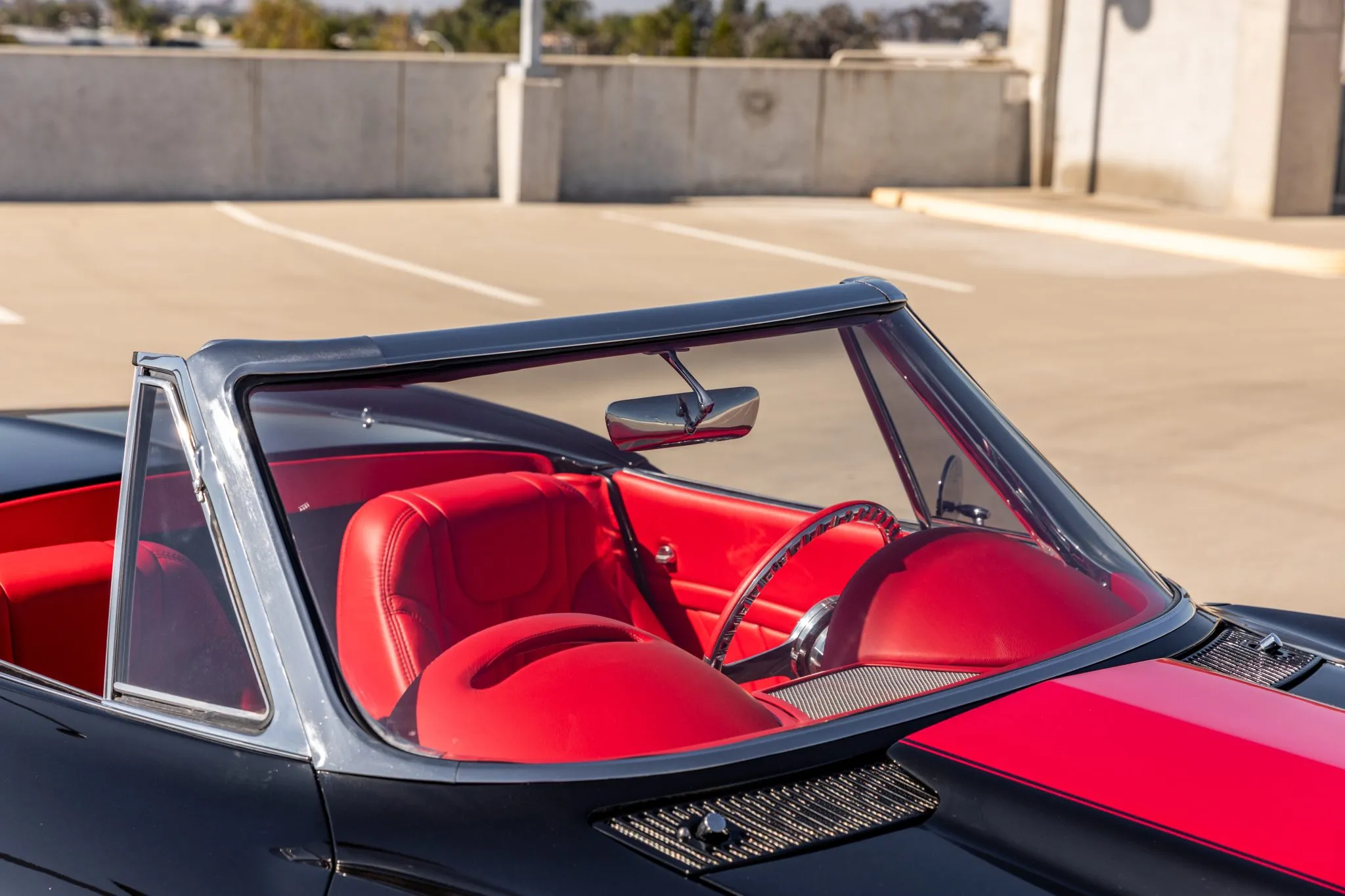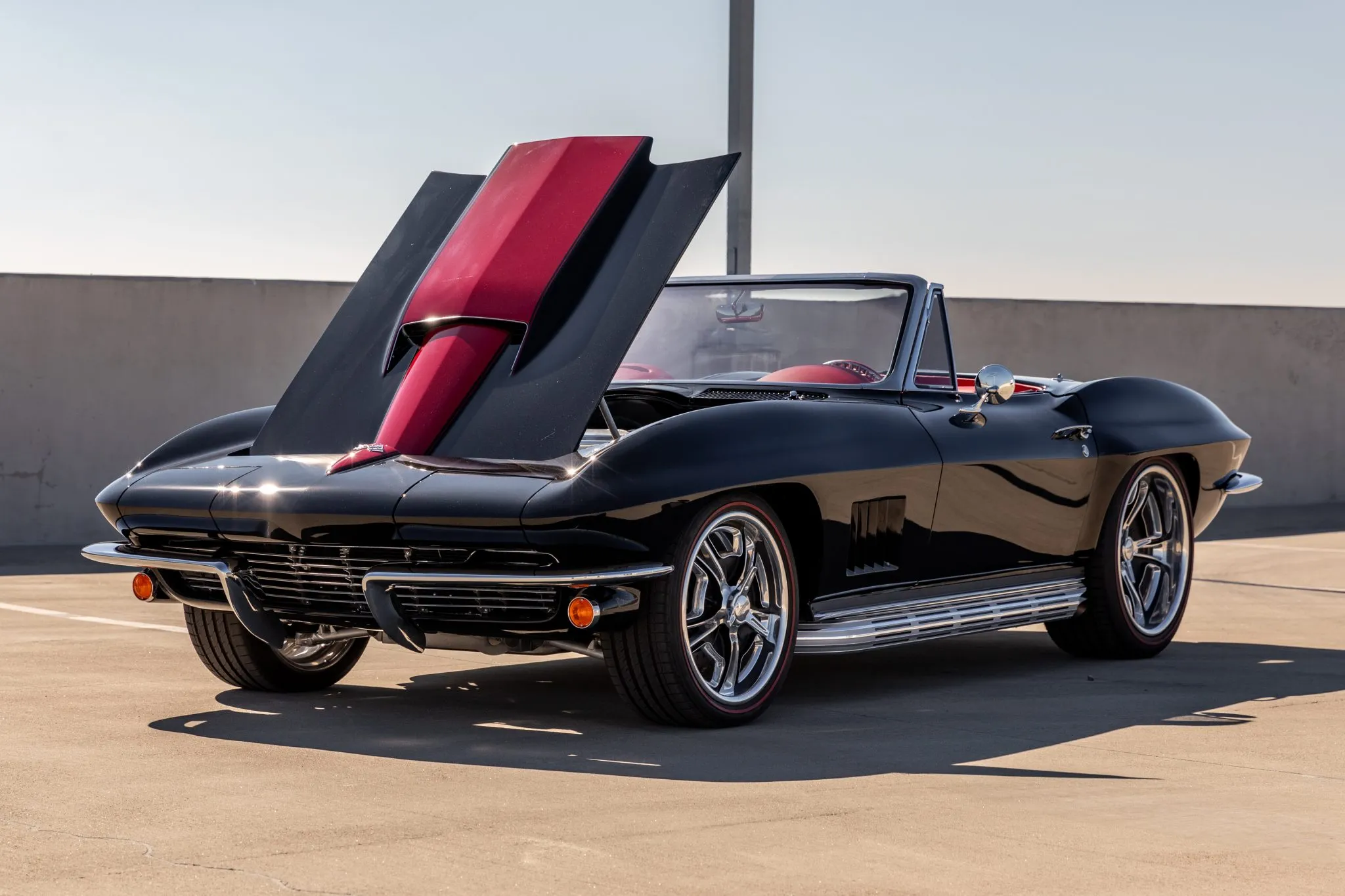 The exterior is a testament to the harmonious marriage of classic styling and contemporary performance, drawing attention with its fibreglass body adorned in a striking black and red theme. This suave convertible sits gracefully on an Art Morrison fabricated chassis, boasting 18-inch Schott Fuel wheels at the front and commanding 20-inch wheels at the rear.