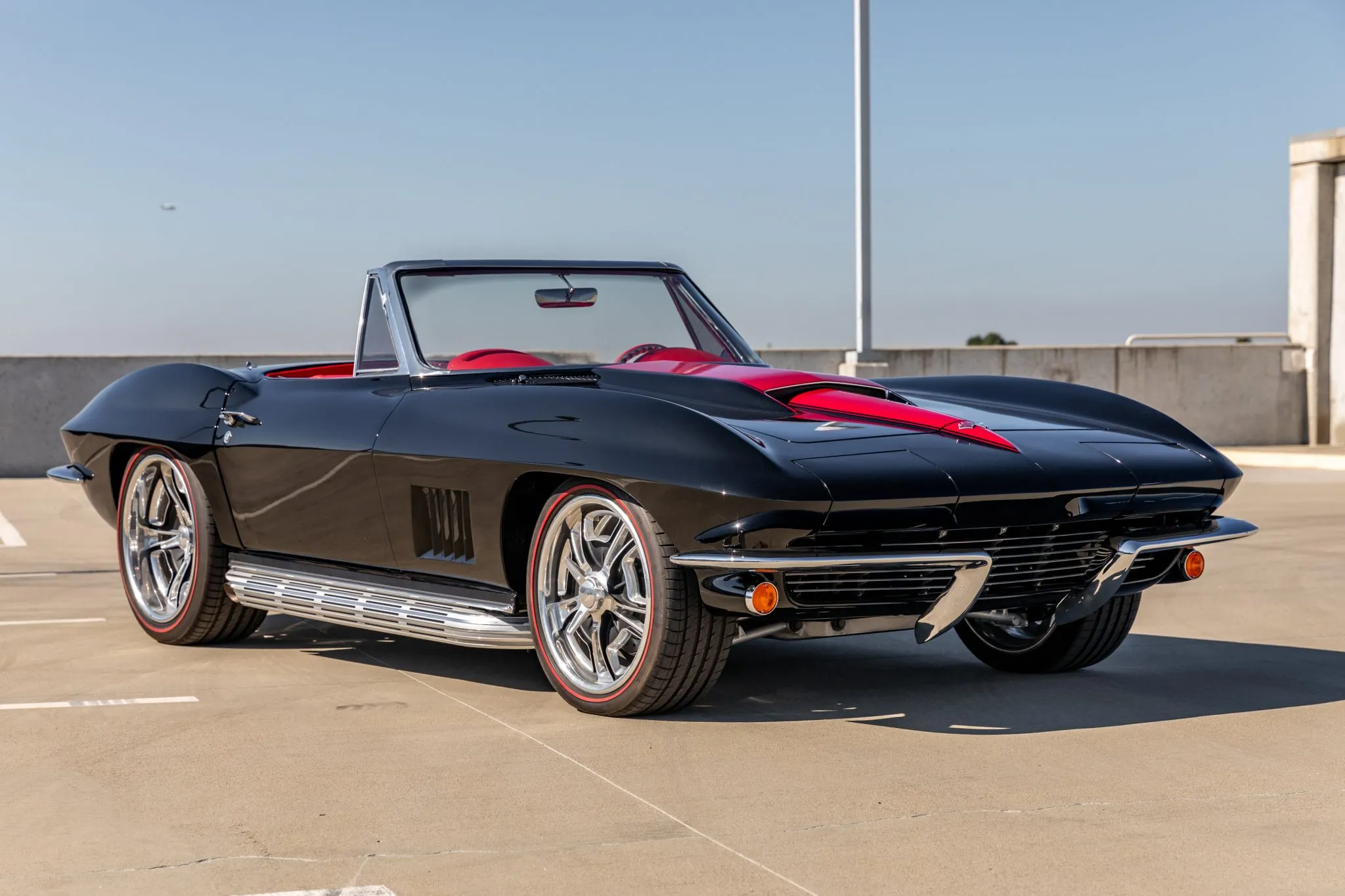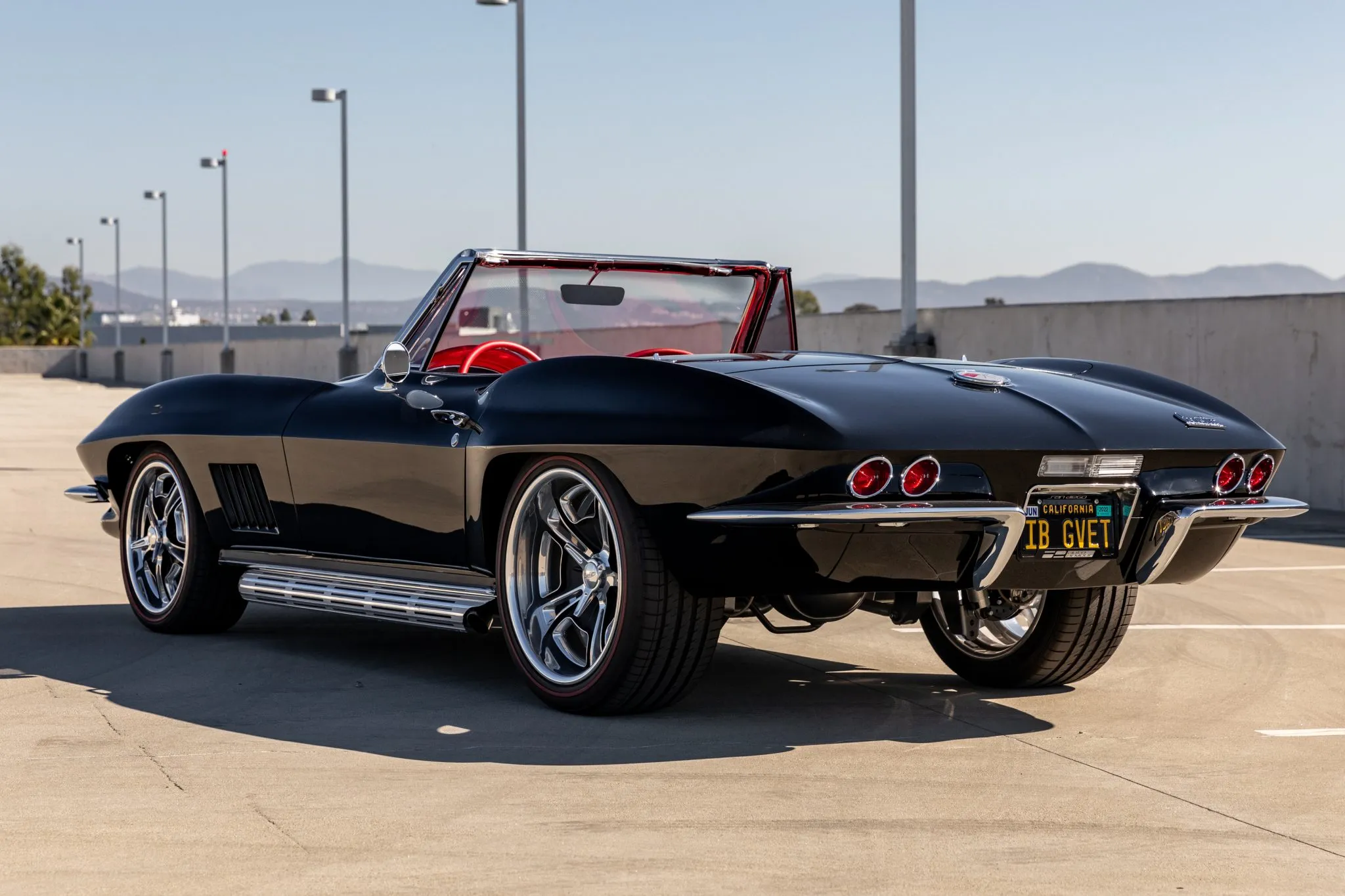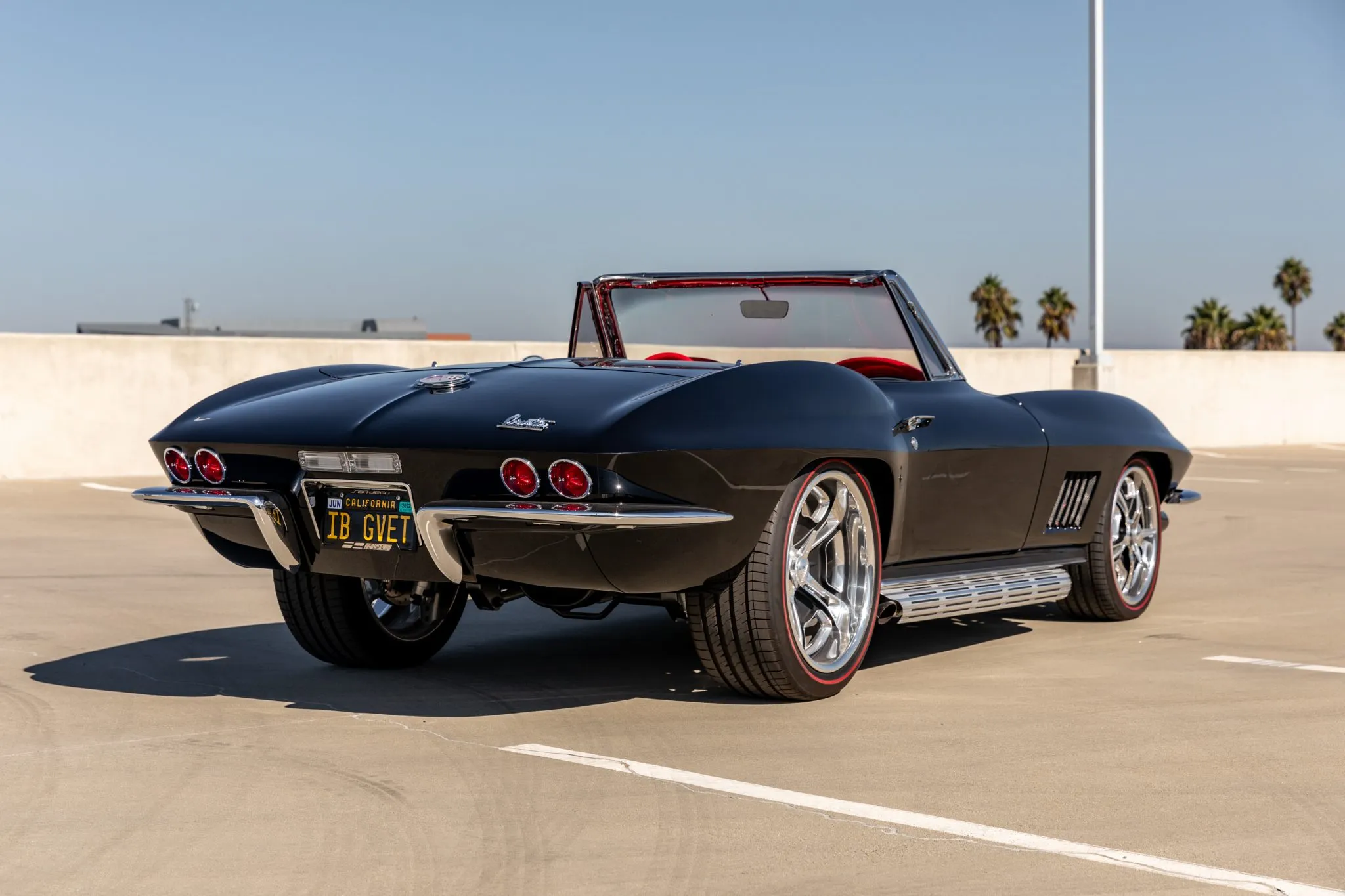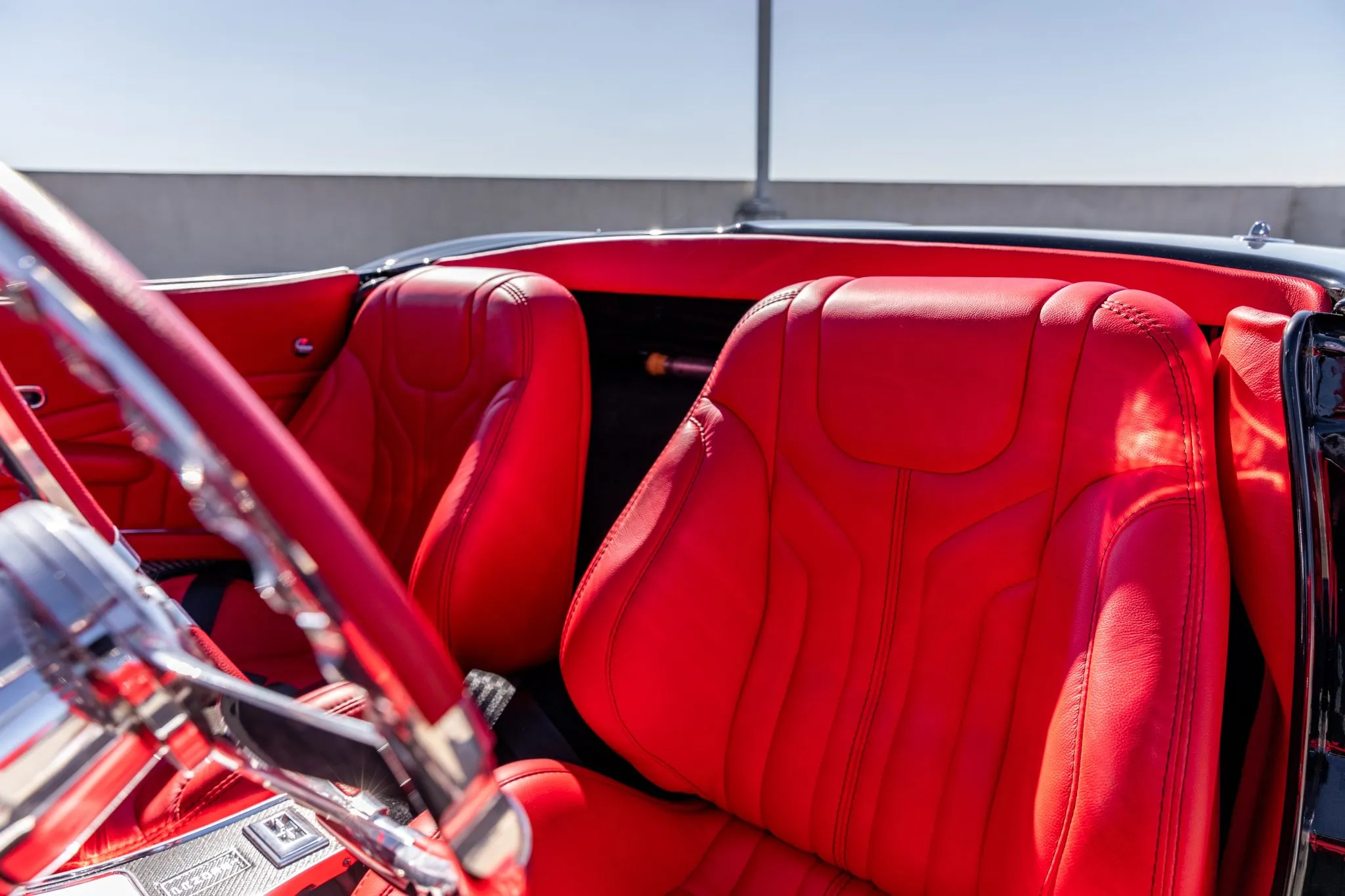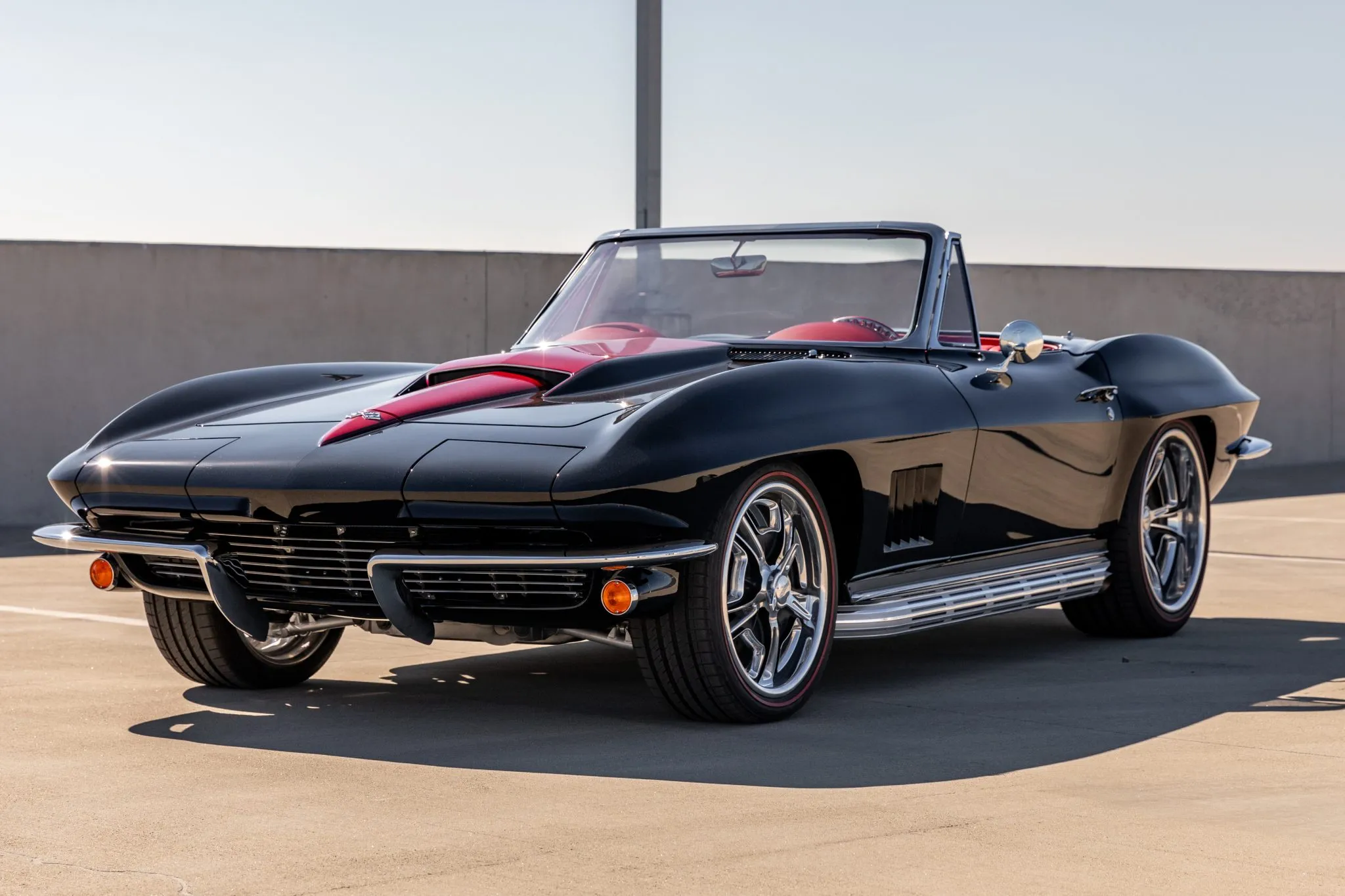 The exterior is a testament to the harmonious marriage of classic styling and contemporary performance, drawing attention with its fibreglass body adorned in a striking black and red theme. This suave convertible sits gracefully on an Art Morrison fabricated chassis, boasting 18-inch Schott Fuel wheels at the front and commanding 20-inch wheels at the rear.