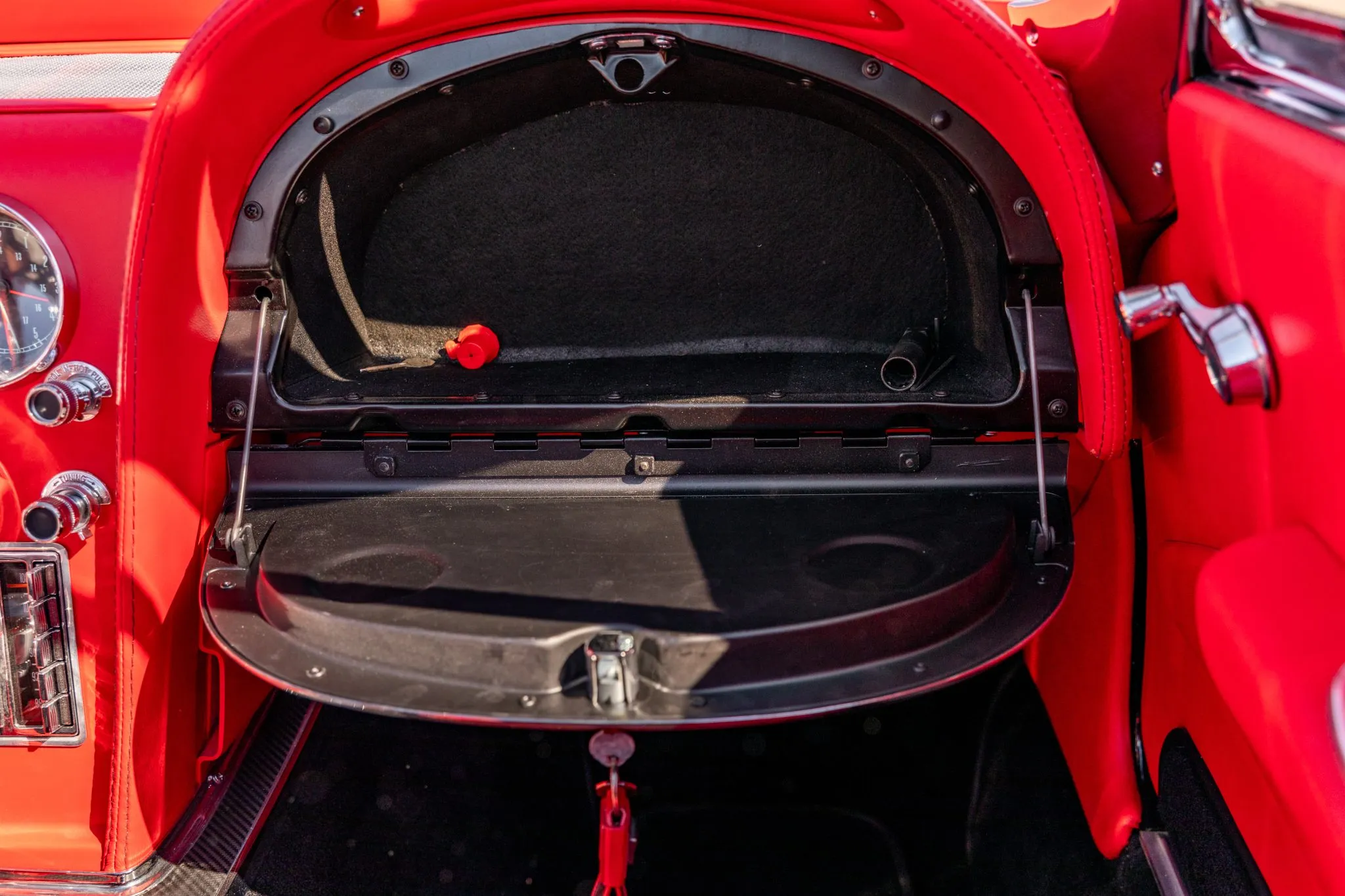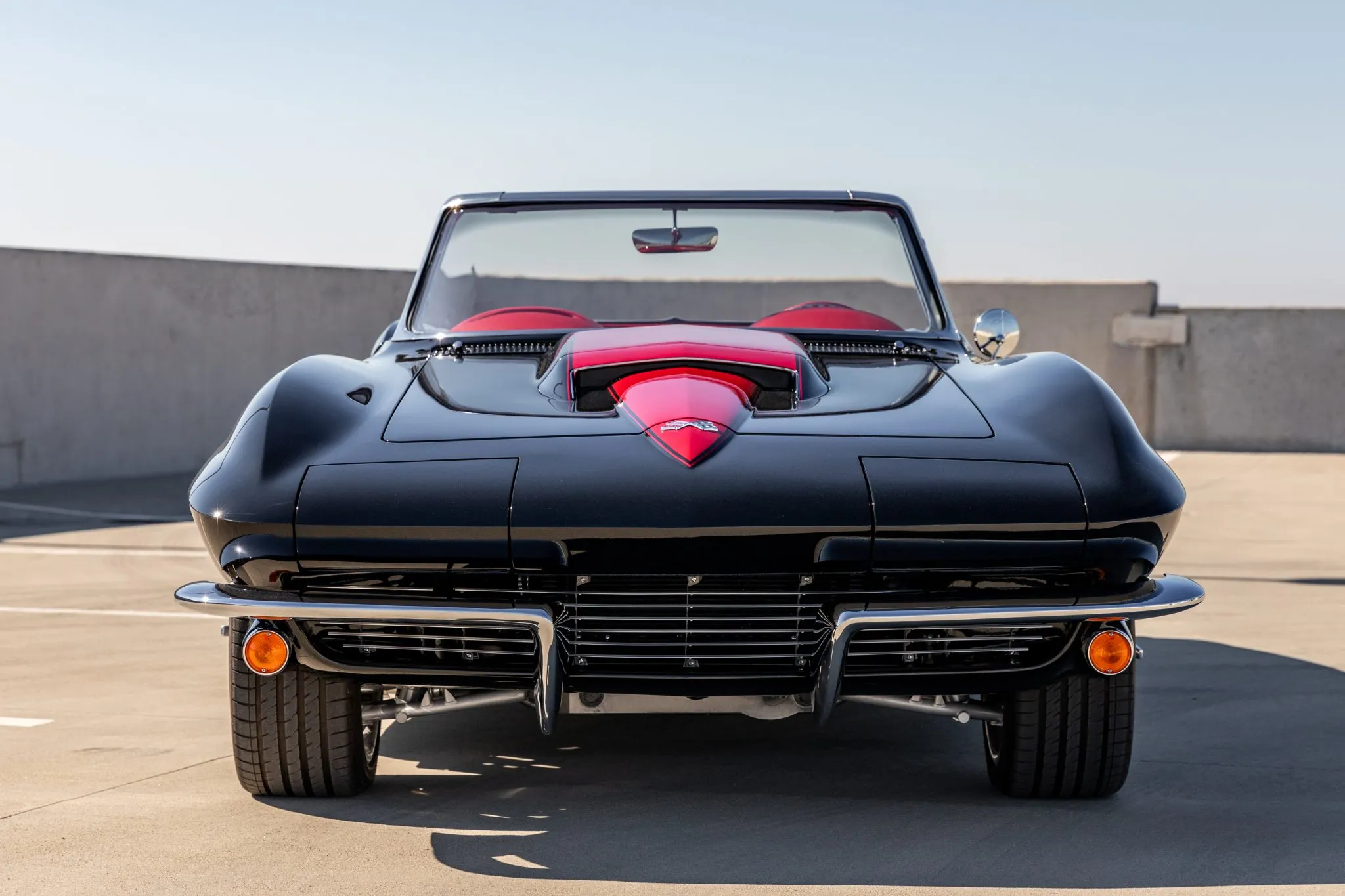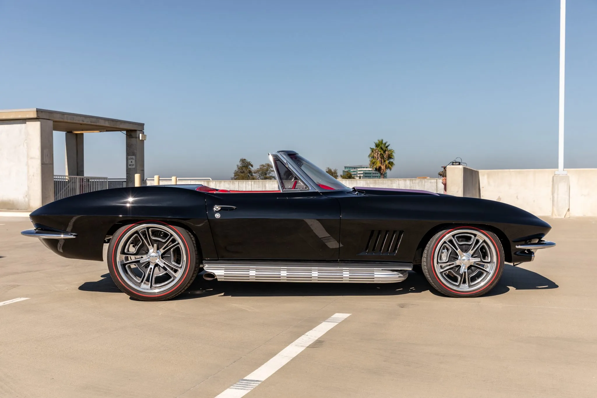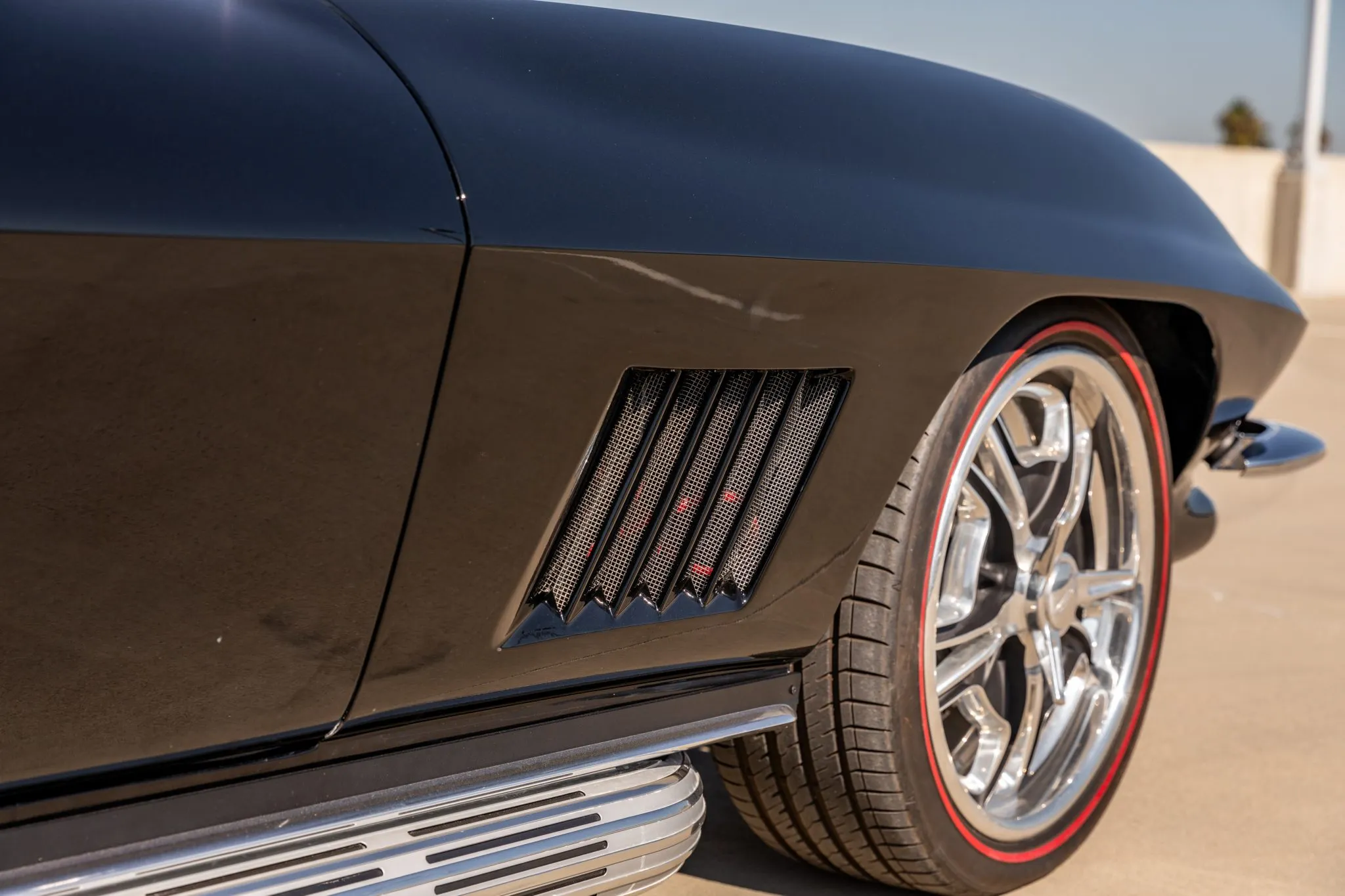 The exterior is a testament to the harmonious marriage of classic styling and contemporary performance, drawing attention with its fibreglass body adorned in a striking black and red theme. This suave convertible sits gracefully on an Art Morrison fabricated chassis, boasting 18-inch Schott Fuel wheels at the front and commanding 20-inch wheels at the rear.