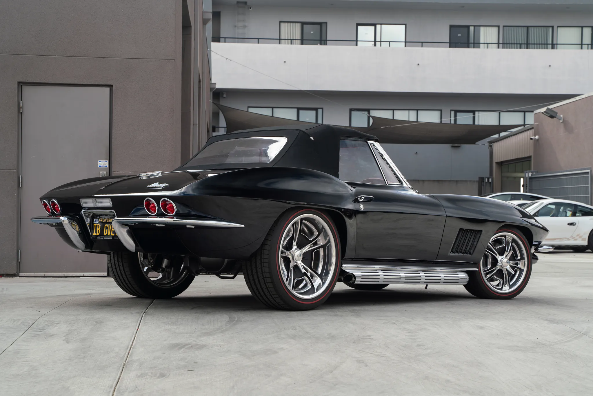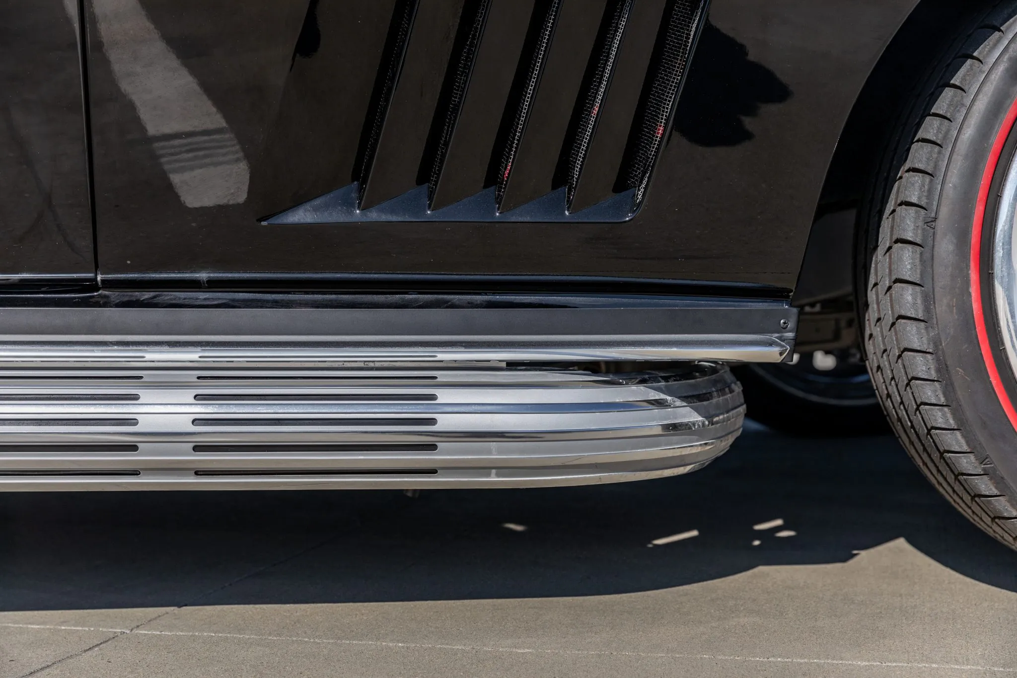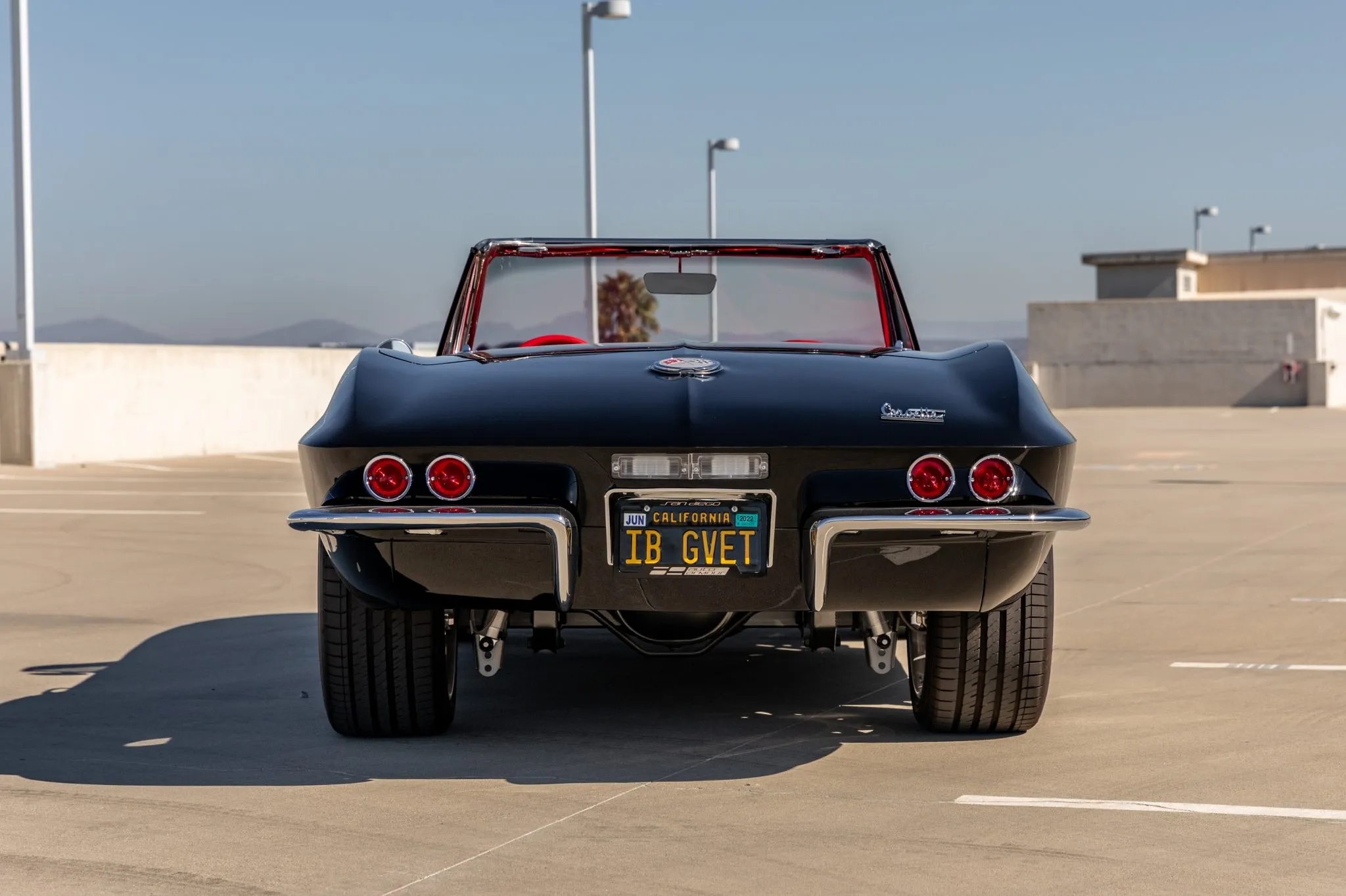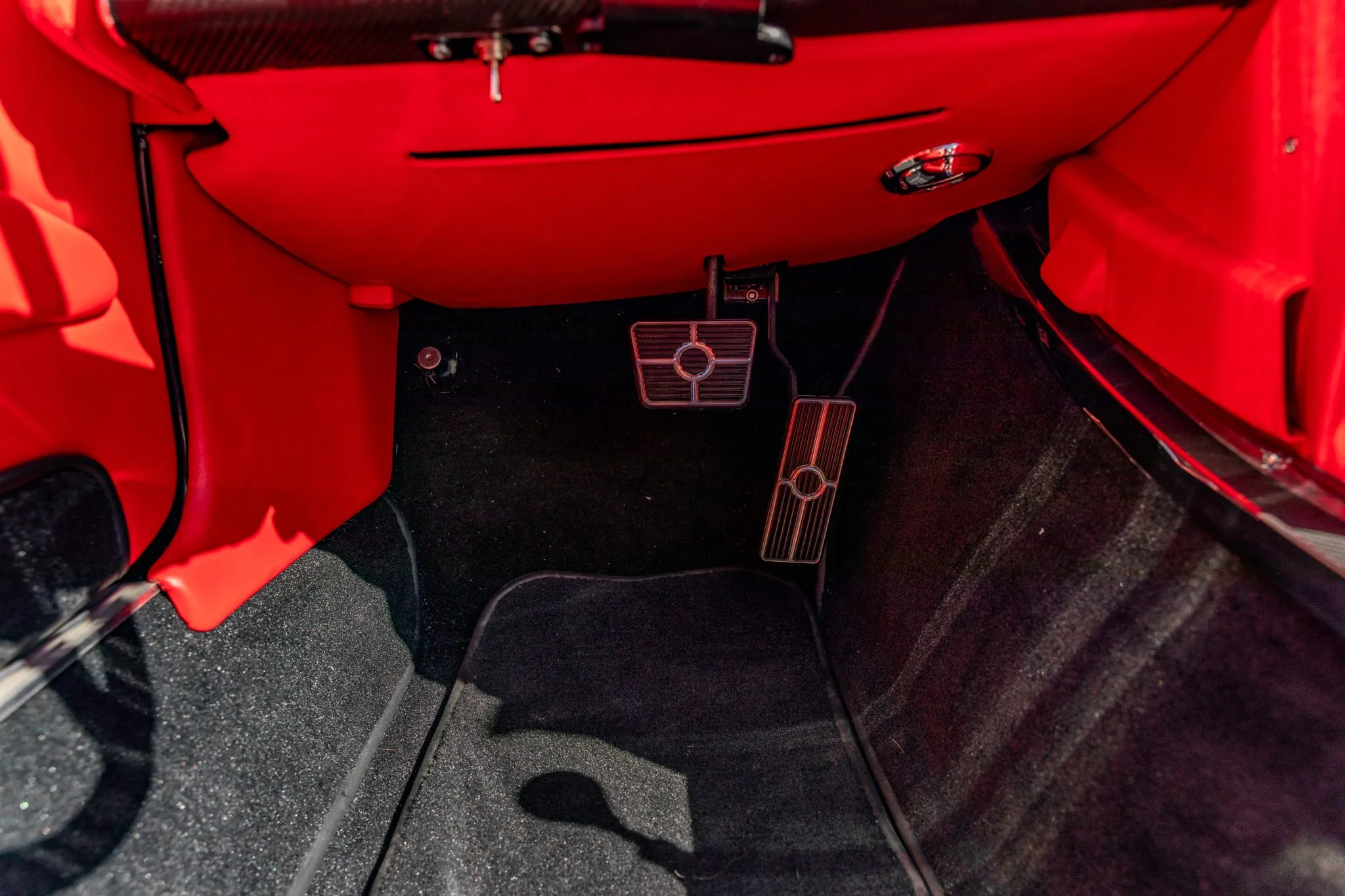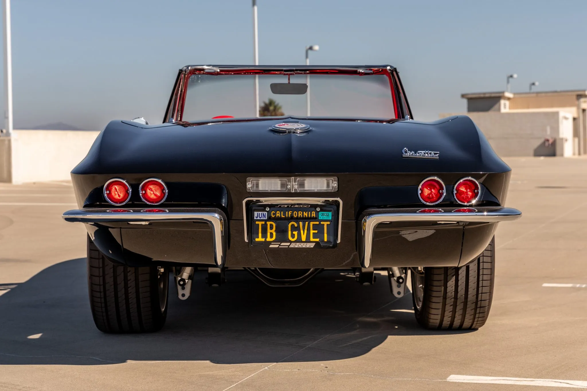 The exterior is a testament to the harmonious marriage of classic styling and contemporary performance, drawing attention with its fibreglass body adorned in a striking black and red theme. This suave convertible sits gracefully on an Art Morrison fabricated chassis, boasting 18-inch Schott Fuel wheels at the front and commanding 20-inch wheels at the rear.