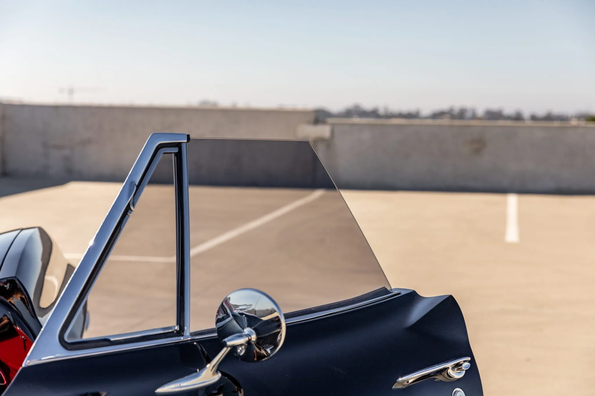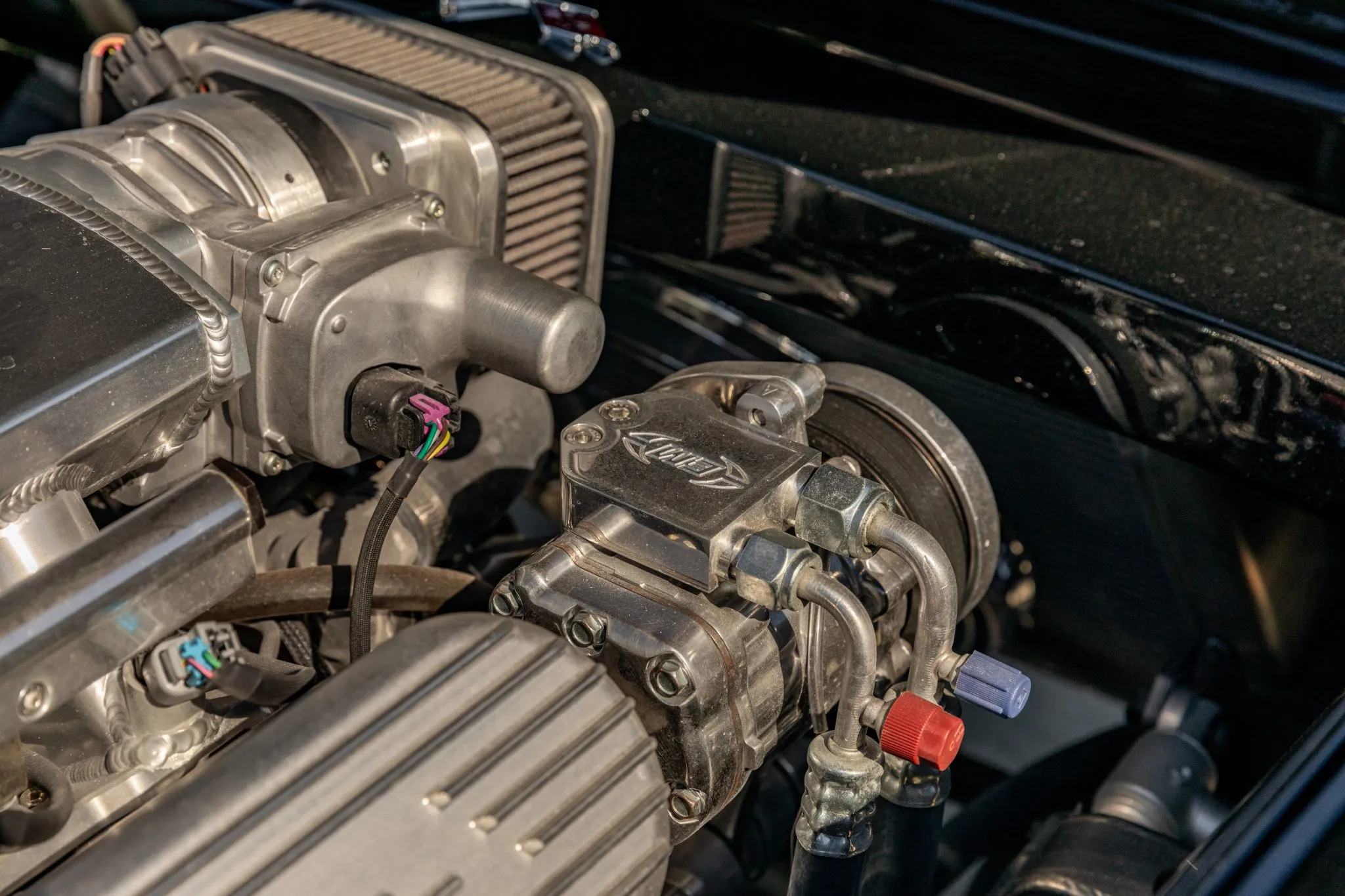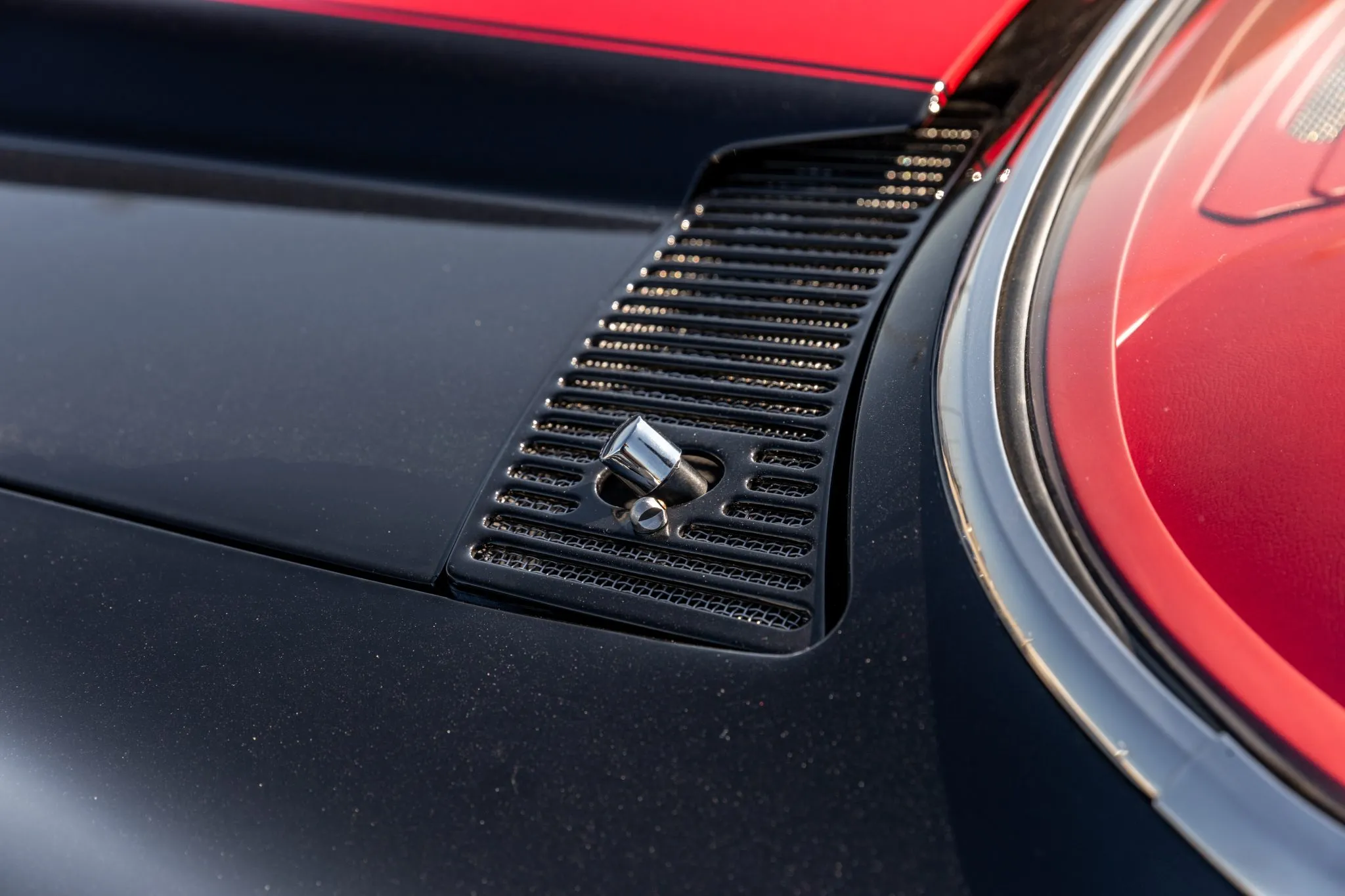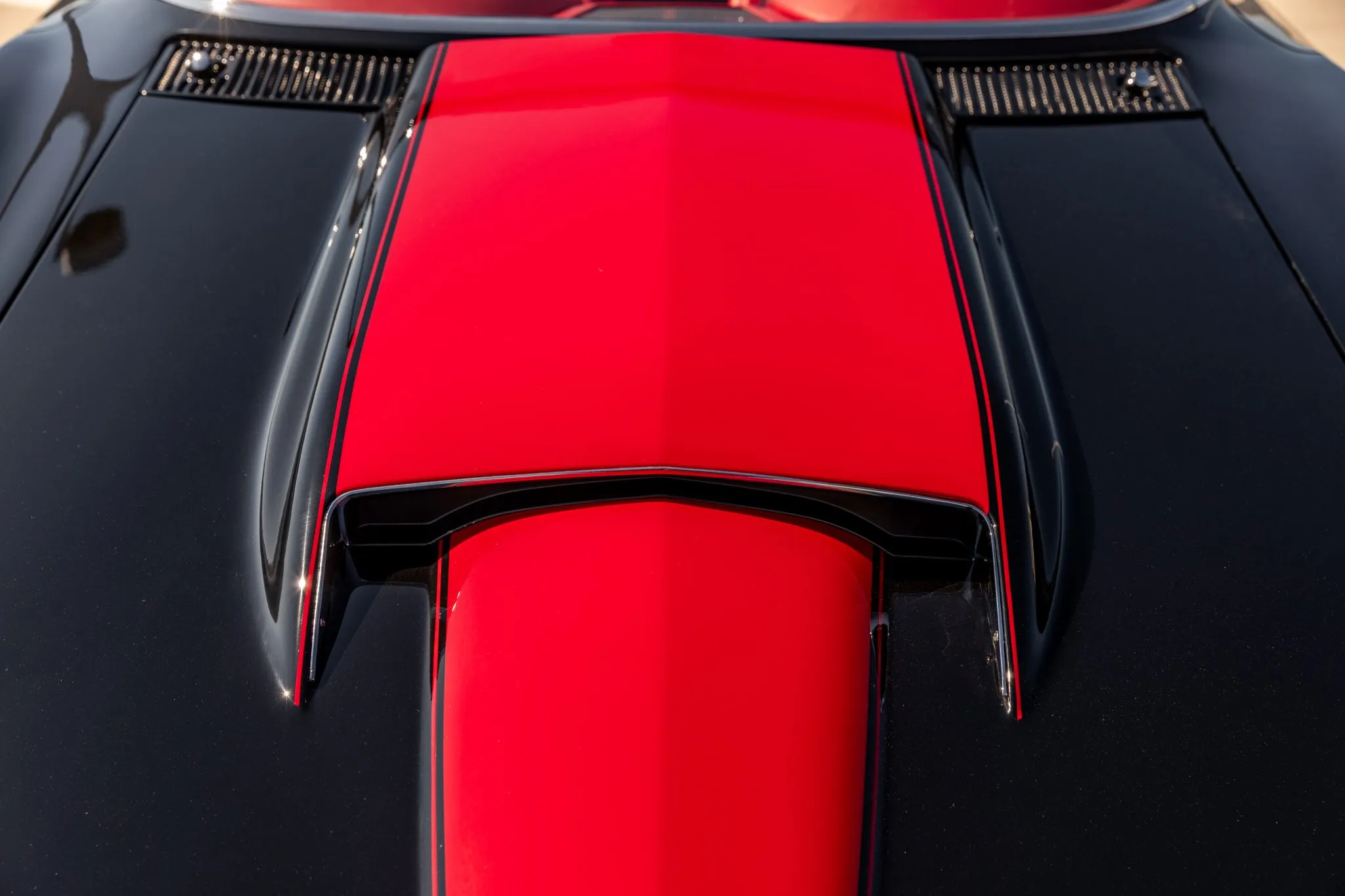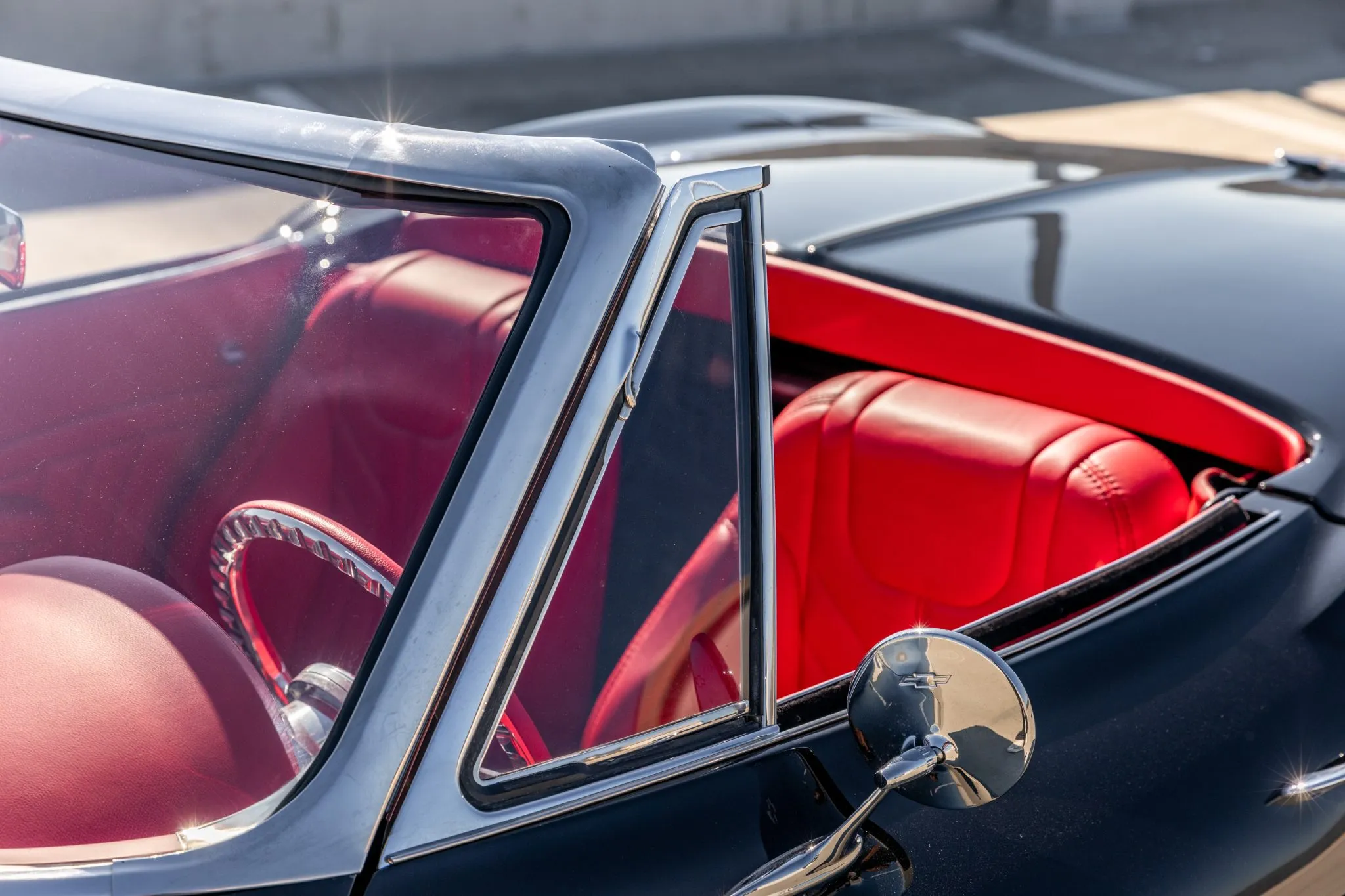 The exterior is a testament to the harmonious marriage of classic styling and contemporary performance, drawing attention with its fibreglass body adorned in a striking black and red theme. This suave convertible sits gracefully on an Art Morrison fabricated chassis, boasting 18-inch Schott Fuel wheels at the front and commanding 20-inch wheels at the rear.