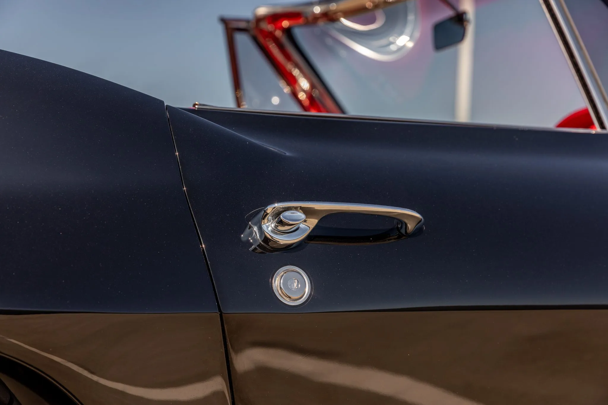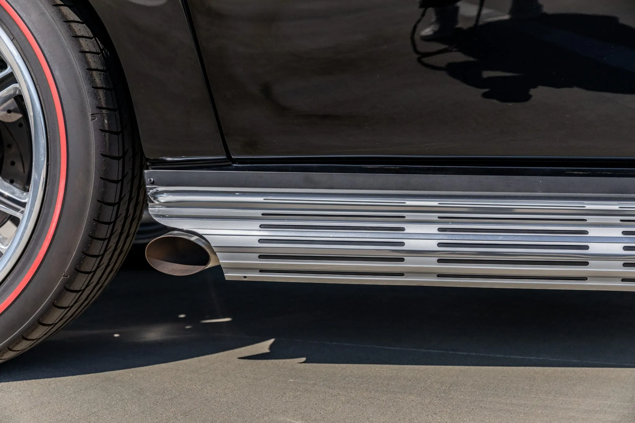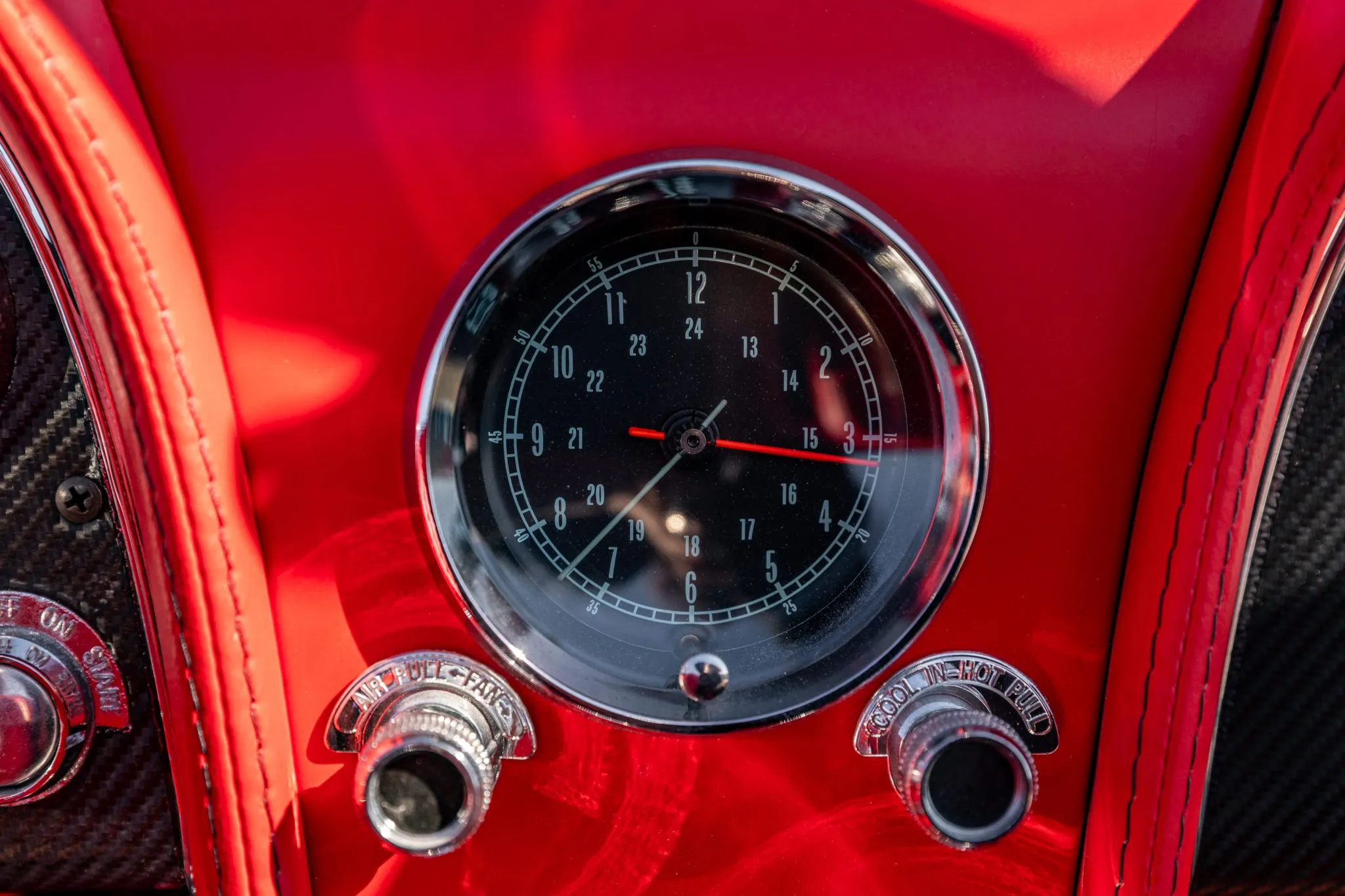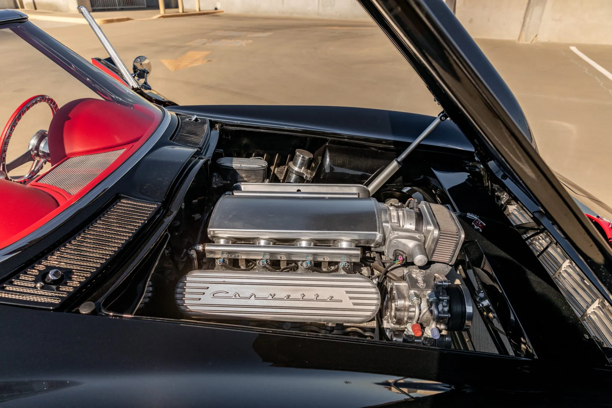 The exterior is a testament to the harmonious marriage of classic styling and contemporary performance, drawing attention with its fibreglass body adorned in a striking black and red theme. This suave convertible sits gracefully on an Art Morrison fabricated chassis, boasting 18-inch Schott Fuel wheels at the front and commanding 20-inch wheels at the rear.