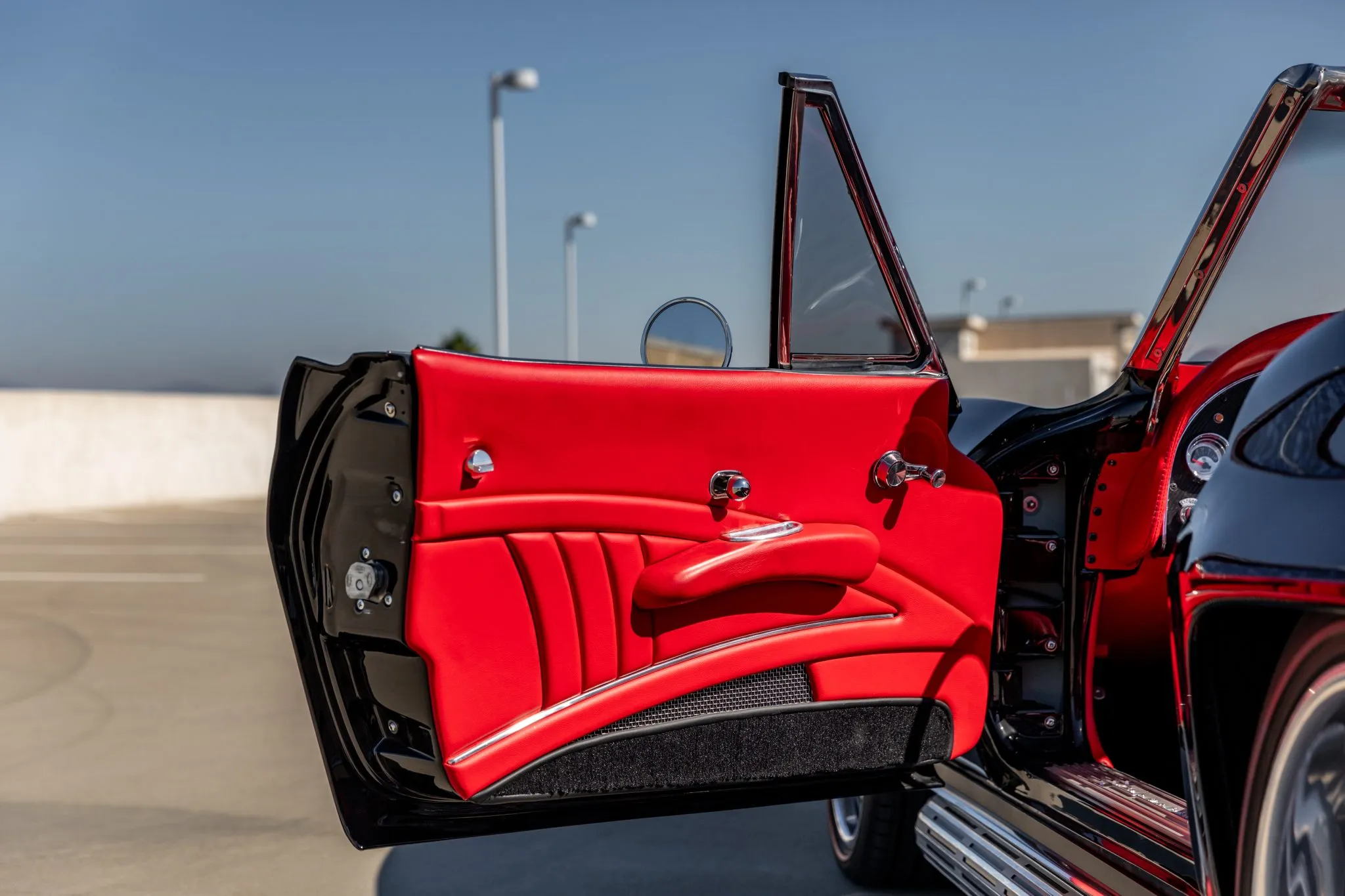 Step inside, and the interior unveils a world of sophistication. Custom-bolstered bucket seats in rich red leather greet occupants, creating a seamless connection with the exterior aesthetic. The colour-matched dashboard, door panels, and shift boot echo the commitment to a cohesive design. While retaining a classic feel with features like a push-button radio and AutoMeter gauges, modern comforts shine through with power windows and a contemporary digital gauge cluster.